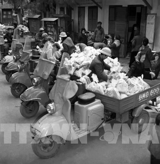 Công ty Bách hóa Bán lẻ Hà Nội tổ chức đóng gói hàng Tết đúng tiêu chuẩn định lượng và điều vận tốt hàng hóa đến bán tại các cửa hàng bách hóa và các quầy hàng tập thể ở cơ quan, xí nghiệp, phục vụ nhân dân trong dịp Tết Canh Tuất 1970. Ảnh: Trần Phác - TTXVN
