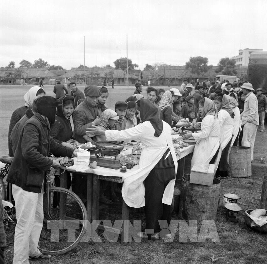 Tổ lưu động bán thịt lợn của Công ty thực phẩm Hà Nội tại khu Lương Yên phục vụ người dân mua sắm Tết Canh Tý 1960. Ảnh: Lâm Hồng – TTXVN