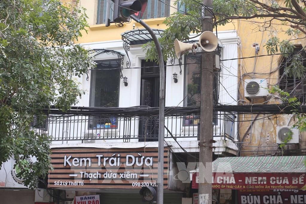 Một cụm loa trên phố Đinh Liệt, phường Hàng Bạc hàng ngày đưa thông tin về phòng, chống dịch COVID-19 lan tỏa đến từng ngõ xóm, len lỏi tới mỗi gia đình. Ảnh: Anh Tuấn – TTXVN
