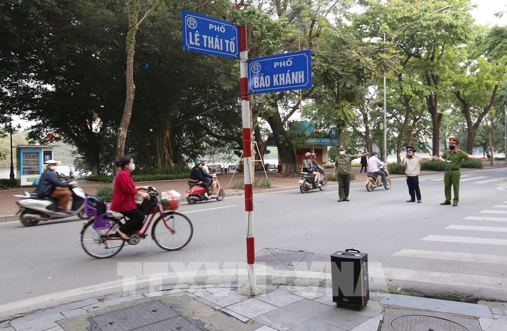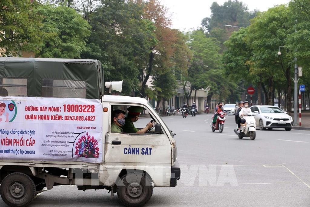 Công an quận Hoàn Kiếm sử dụng loa trên xe chuyên dụng nhắc nhở người dân Thủ đô không tập trung đông người, tập thể dục bên bờ hồ Gươm trong những ngày giãn cách xã hội. Ảnh: Anh Tuấn – TTXVN