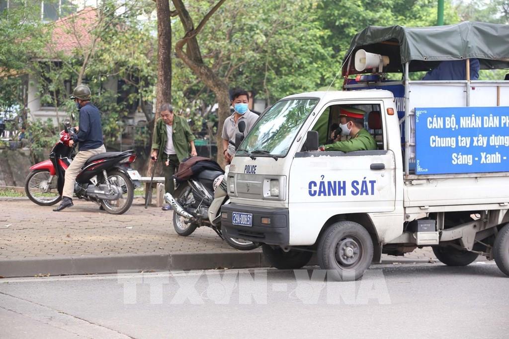 Công an phường Nguyễn Du sử dụng loa trên xe chuyên dụng nhắc nhở người dân Thủ đô không tập trung đông người, tập thể dục bên bờ hồ Thiền Quang trong những ngày giãn cách xã hội. Ảnh: Anh Tuấn – TTXVN