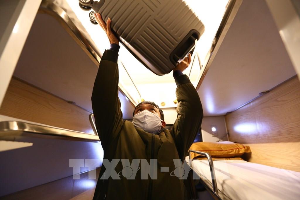 Anh Phạm Kiên Trung sắp xếp hành lý trên tàu để về quê Nghệ An. Ảnh: Minh Quyết - TTXVN
