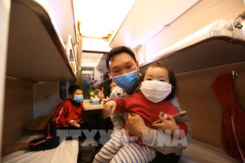 Gia đình anh Nhơn, chị Thảo về quê Ninh Thuận trên chuyến tàu SE3. Ảnh: Minh Quyết - TTXVN