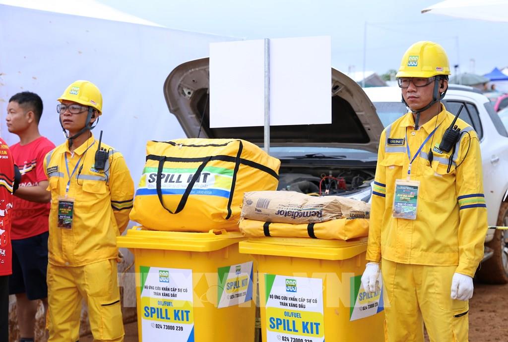 Lực lượng cứu hộ chuẩn bị các Bộ ứng cứu khẩn cấp sự cố tràn xăng dầu để không ảnh hưởng đến môi trường. Ảnh: Hoàng Hiếu - TTXVN