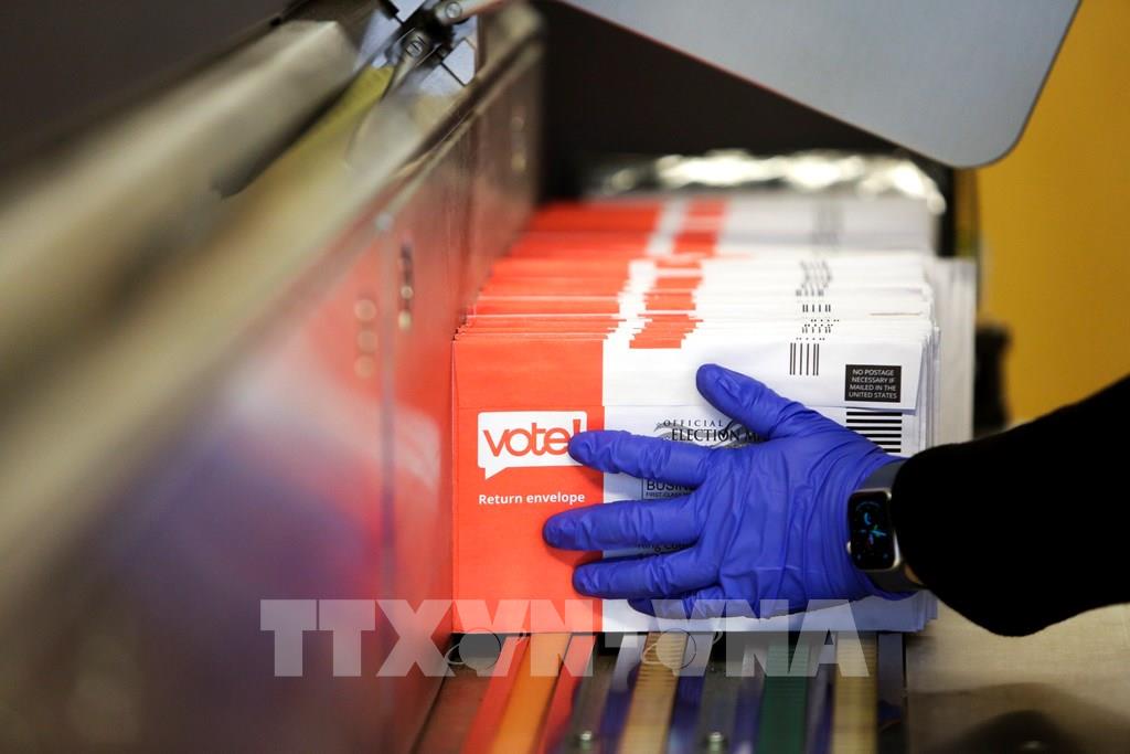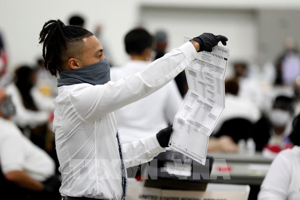 Nhân viên bầu cử Mỹ kiểm phiếu phổ thông được bỏ qua đường bưu điện tại điểm bầu cử ở Detroit, bang Michigan ngày 4/11/2020. Ảnh: AFP/TTXVN