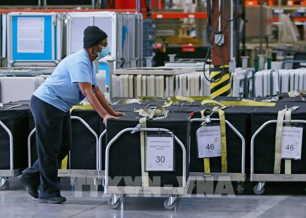 Nhân viên chuyển vào kho các máy kiểm phiếu đã được sử dụng trong Ngày Bầu cử tại Bắc Las Vegas, bang Nevada ngày 4/11/2020. Ảnh: AFP/TTXVN