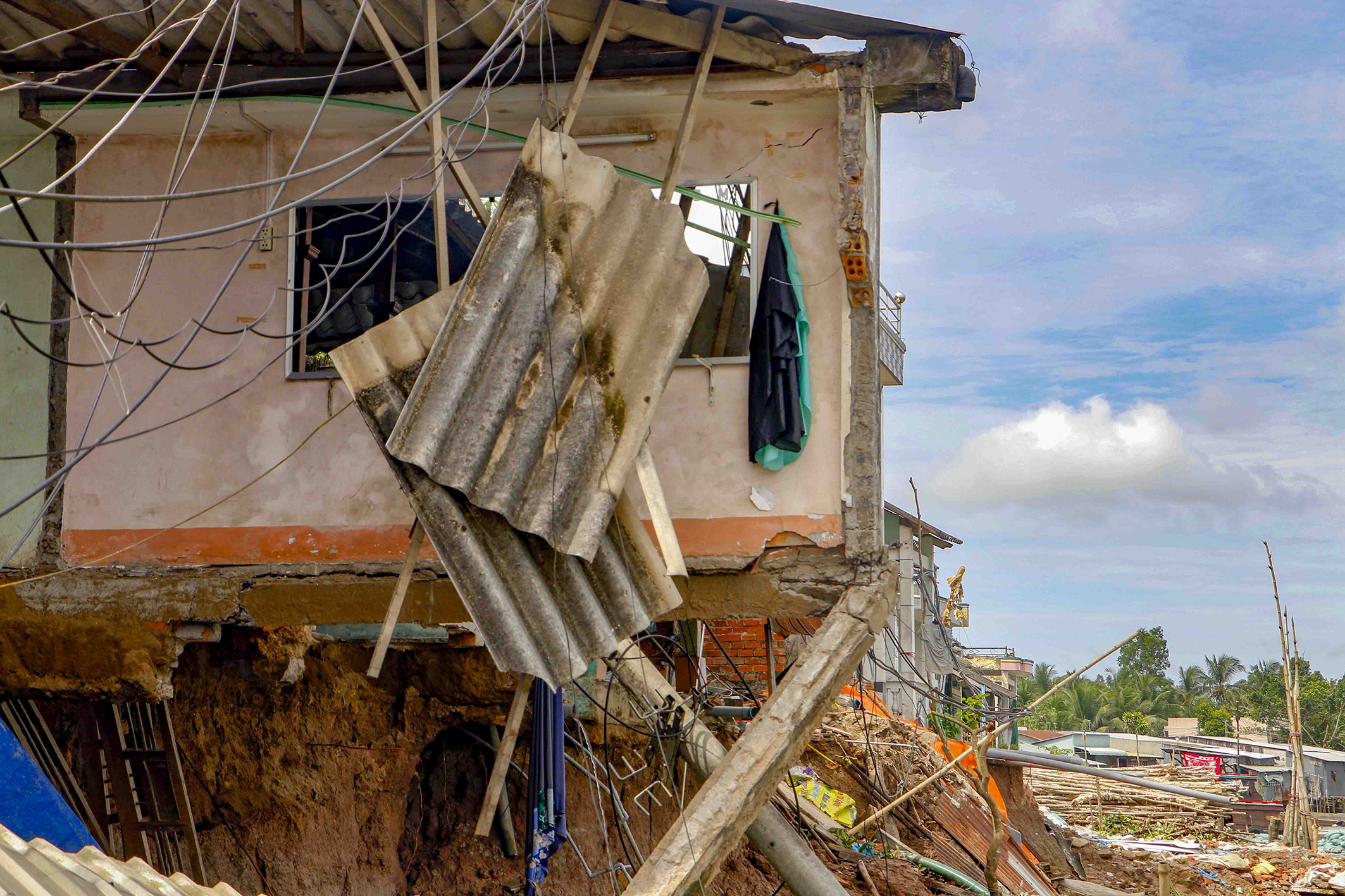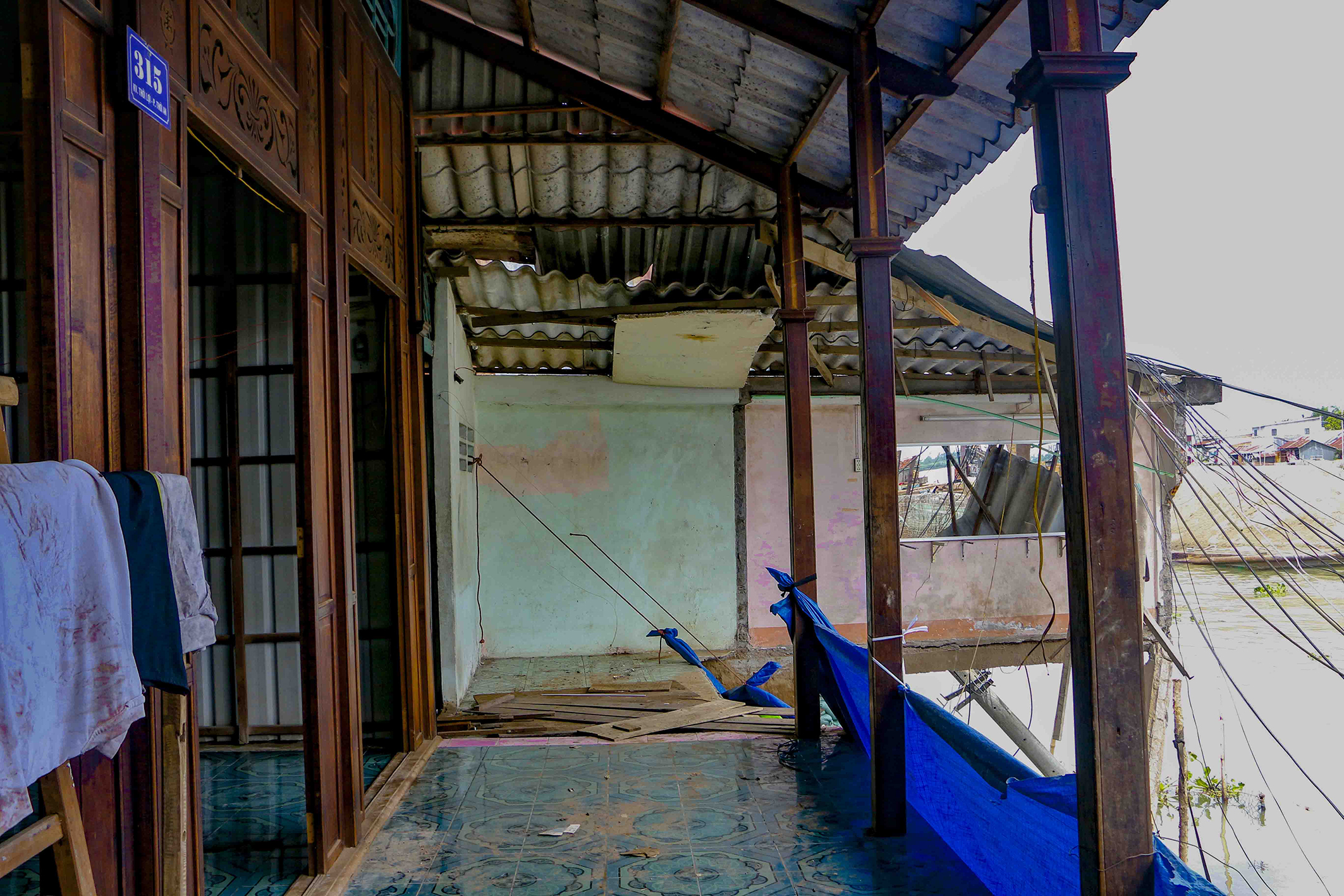 Một căn nhà bị sụp hoàn toàn xuống sông, chỉ còn lại phần vách nằm chơi vơi. Ảnh: Thanh Liêm/TTXVN