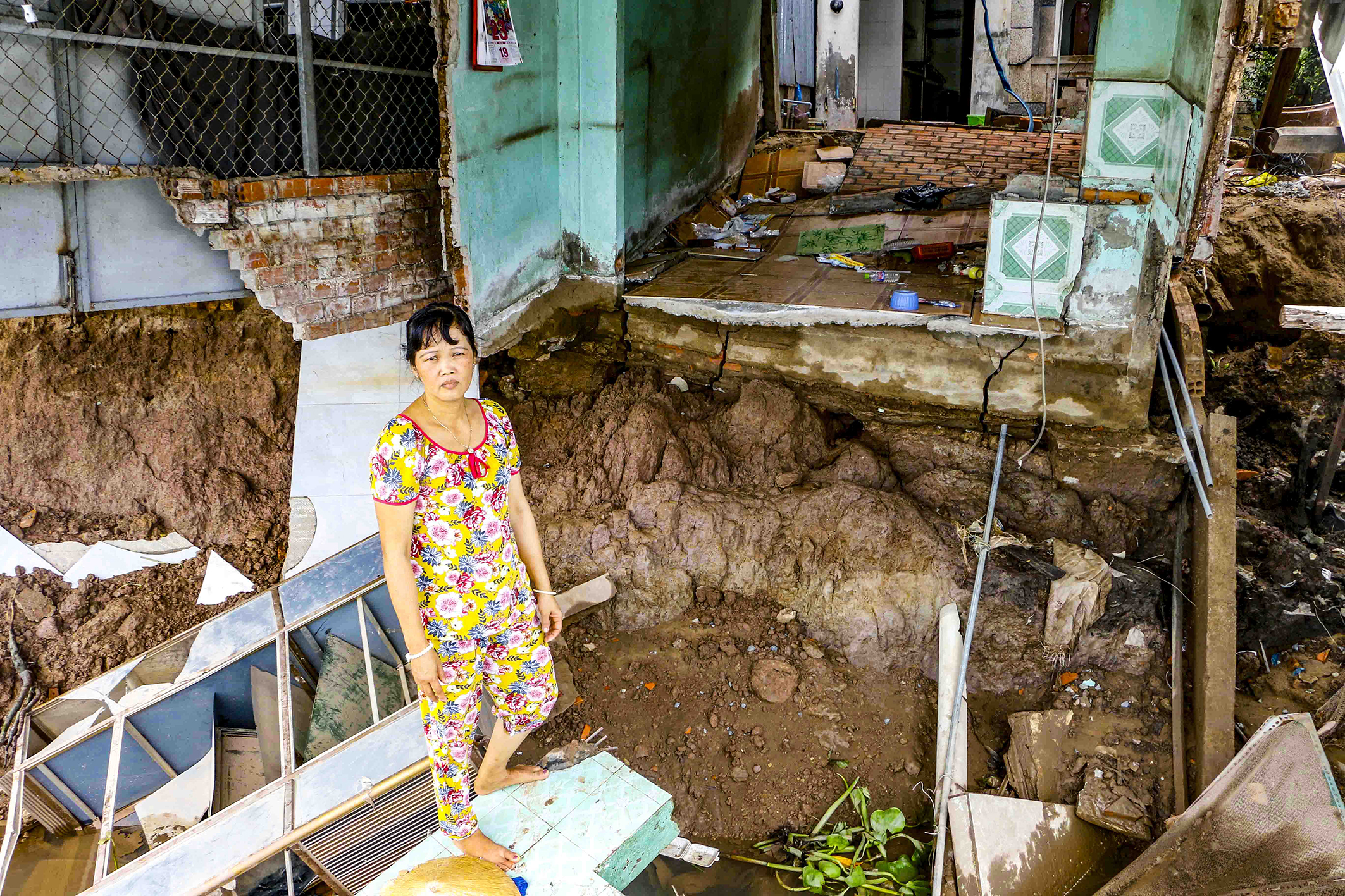 Chị Nguyễn Thị Bích Liên đứng tại vị trí từng là căn nhà của chị trước khi vụ sạt lở xảy ra. Ảnh: Thanh Liêm/TTXVN