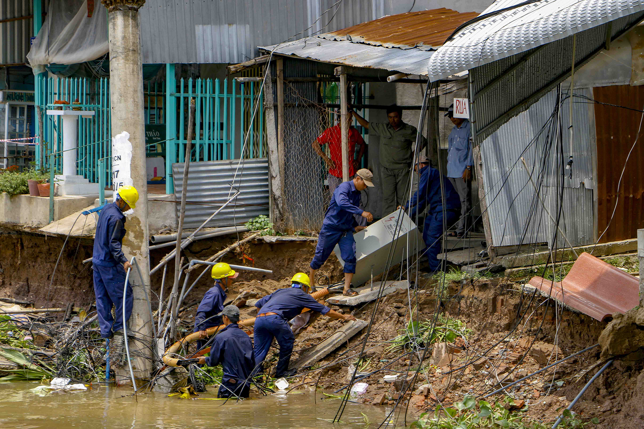 Trụ điện trung thế cấp điện cho khu vực Thới Lợi bị sạt lở sụp xuống sông. Ảnh: Thanh Liêm/TTXVN