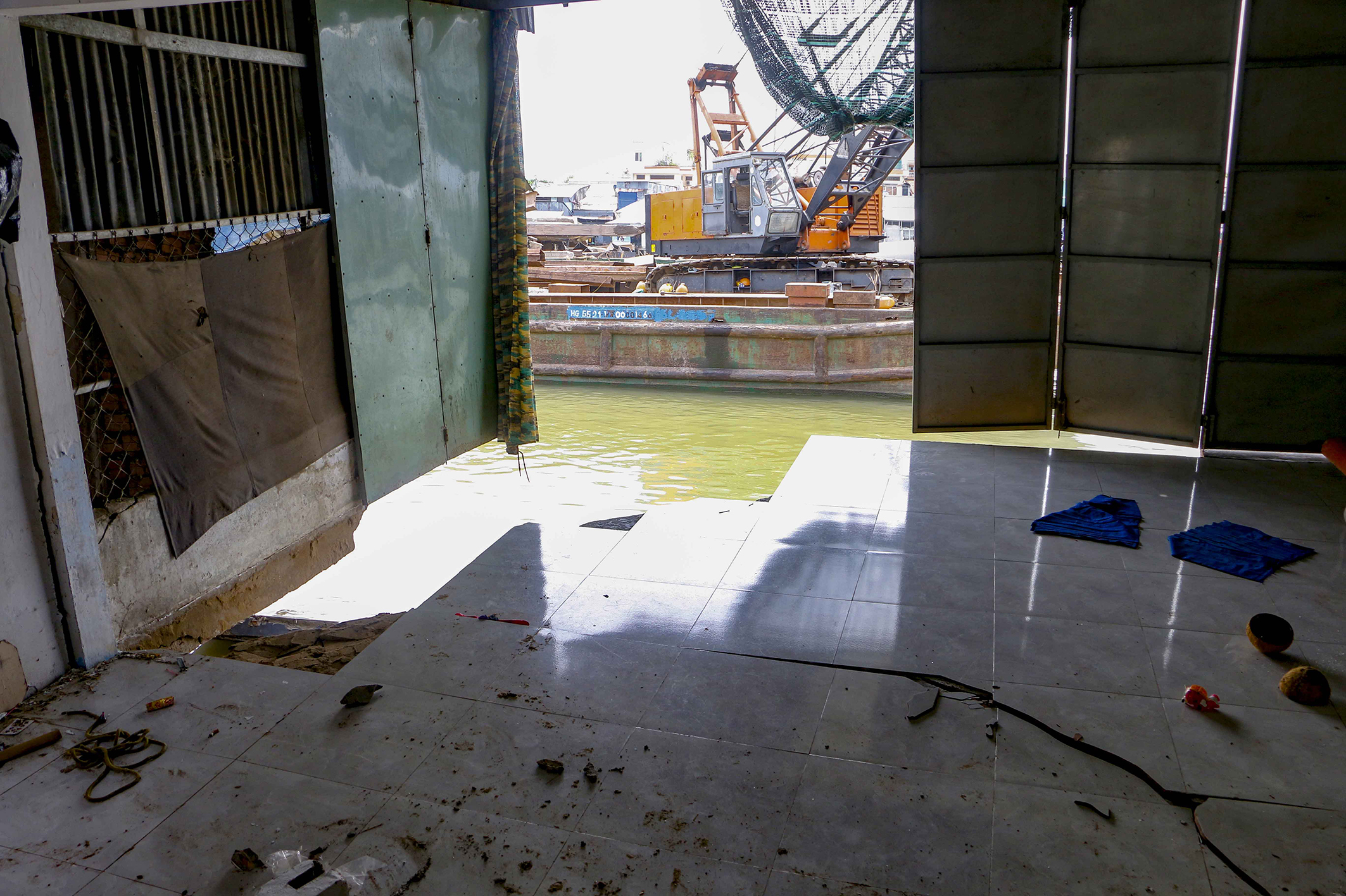 Chiếc sà lan của đơn vị thi công bờ kè đang chuẩn bị đóng cọc thì sạt lở xảy ra. Việc thi công phải tạm dừng để ngành chức năng khảo sát, khắc phục hậu quả. Ảnh: Thanh Liêm/TTXVN