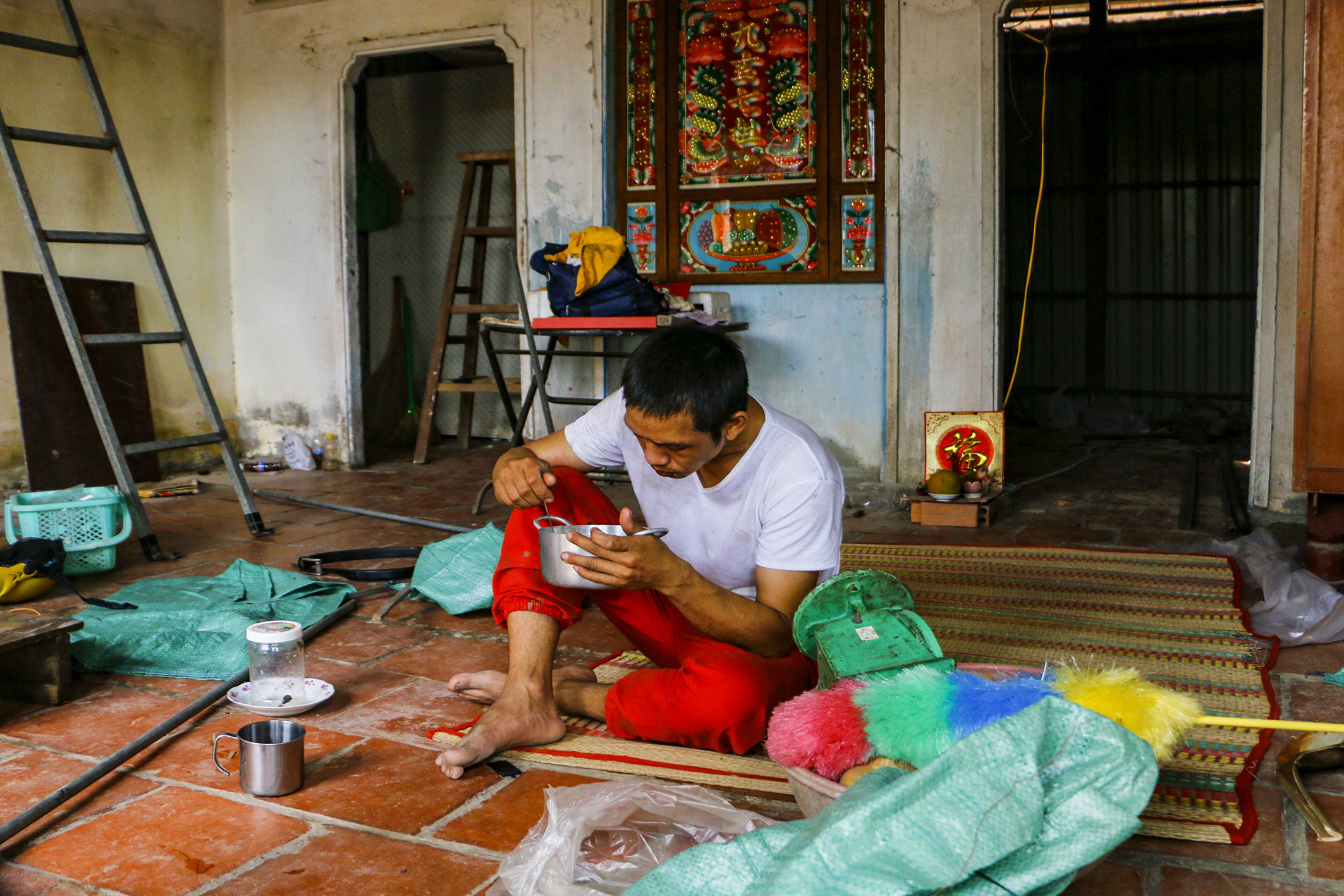 Anh Nguyễn Thanh Tùng, một trong 11 hộ dân bị ảnh hưởng bởi vụ sạt lở tranh thủ ăn cơm trưa trong căn phòng còn lại của ngôi nhà. Ảnh: Thanh Liêm/TTXVN