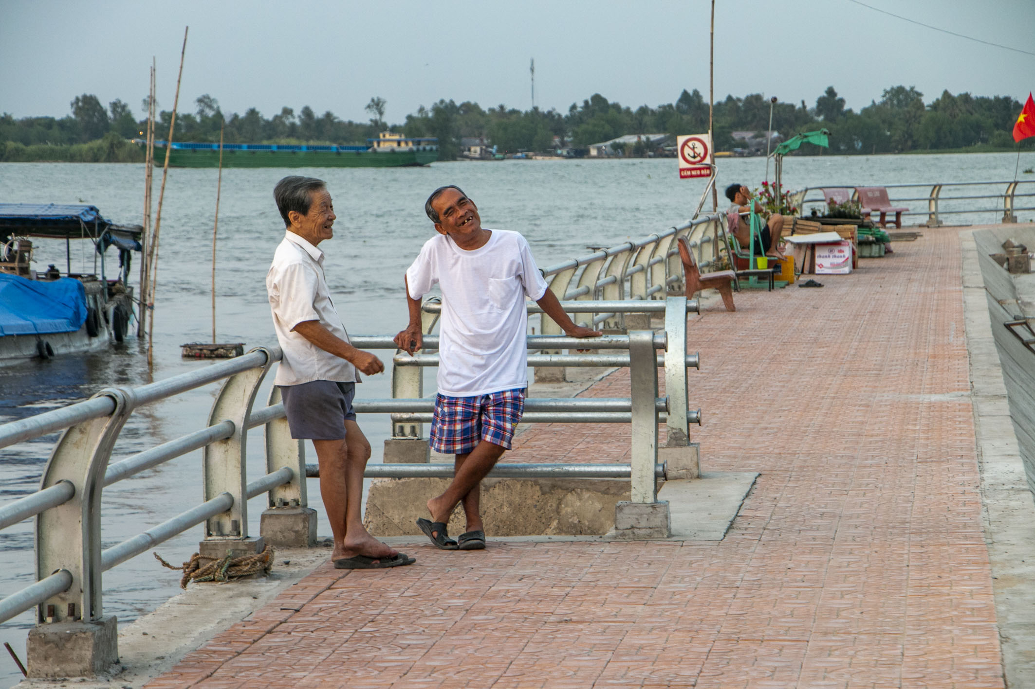 Ông Trần Văn Phong (74 tuổi, bên trái) trò chuyện cùng người bạn hàng xóm trên bờ kè trong một buổi chiều cuối tháng 2/2020. Ảnh: Thanh Liêm/TTXVN