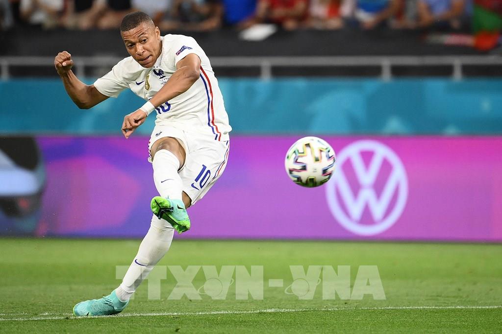 Tiền đạo tuyển Pháp Kylian Mbappe sút bóng về phía khung thành thủ môn Bồ Đào Nha trong trận đấu lượt cuối bảng F, vòng chung kết EURO 2020 tại Budapest, Hungary ngày 23/6/2021. Ảnh: AFP/TTXVN