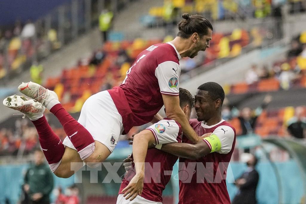 Các cầu thủ Áo ăn mừng bàn thắng duy nhất của Baumgartner ghi vào lưới tuyển Ukraine để chính thức đoạt vé vào vòng 1/8. Ảnh: AFP/TTXVN