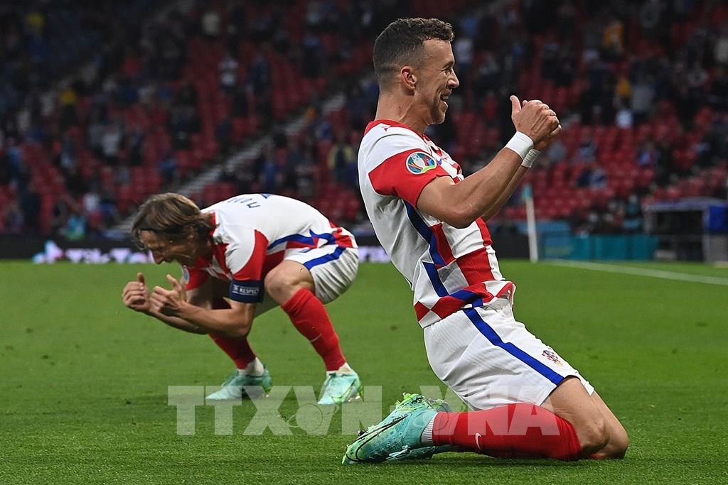 Hai lão tướng kỳ cựu của Croatia Ivan Perisic (phải) và Luka Modric mừng chiến thắng quan trọng của đội nhà trong trận đấu lượt cuối bảng D gặp Scotland. Ảnh: AFP/TTXVN