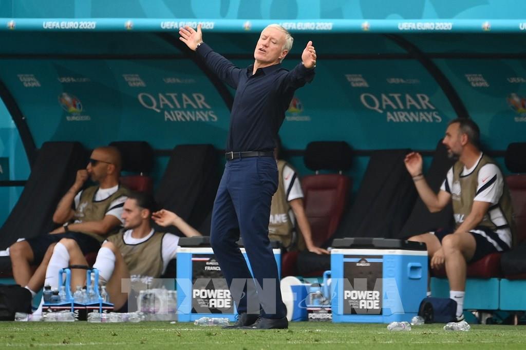 Huấn luyện viên đội tuyển Pháp Didier Deschamps ra sát đường biên chỉ đạo các cầu thủ trong trận Pháp gặp Hungary ở lượt đấu thứ hai bảng F. Ảnh: AFP/TTXVN