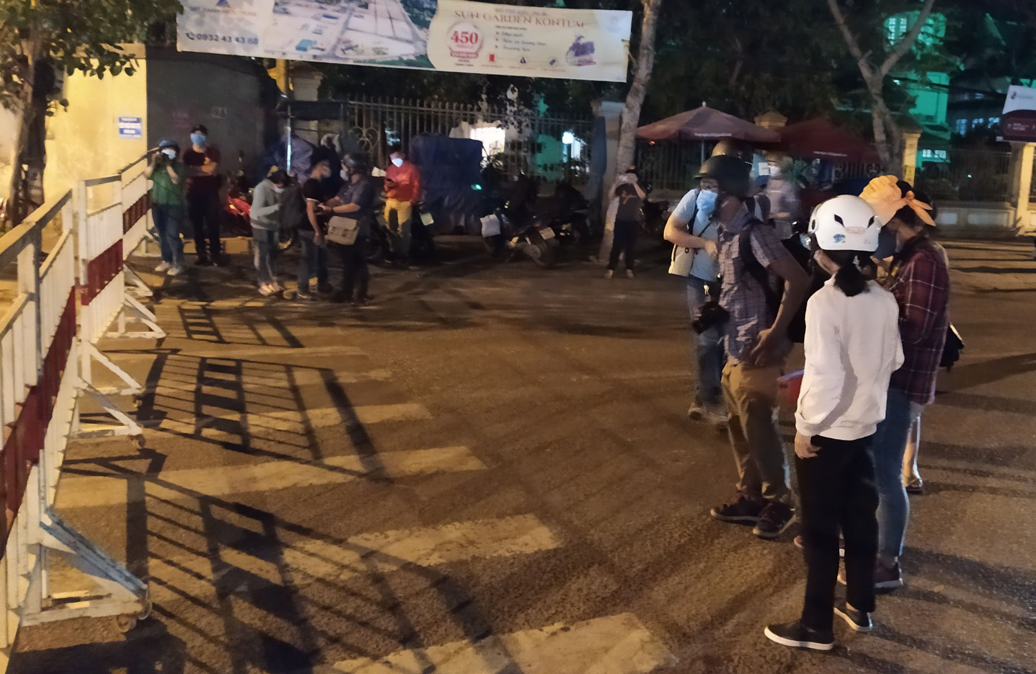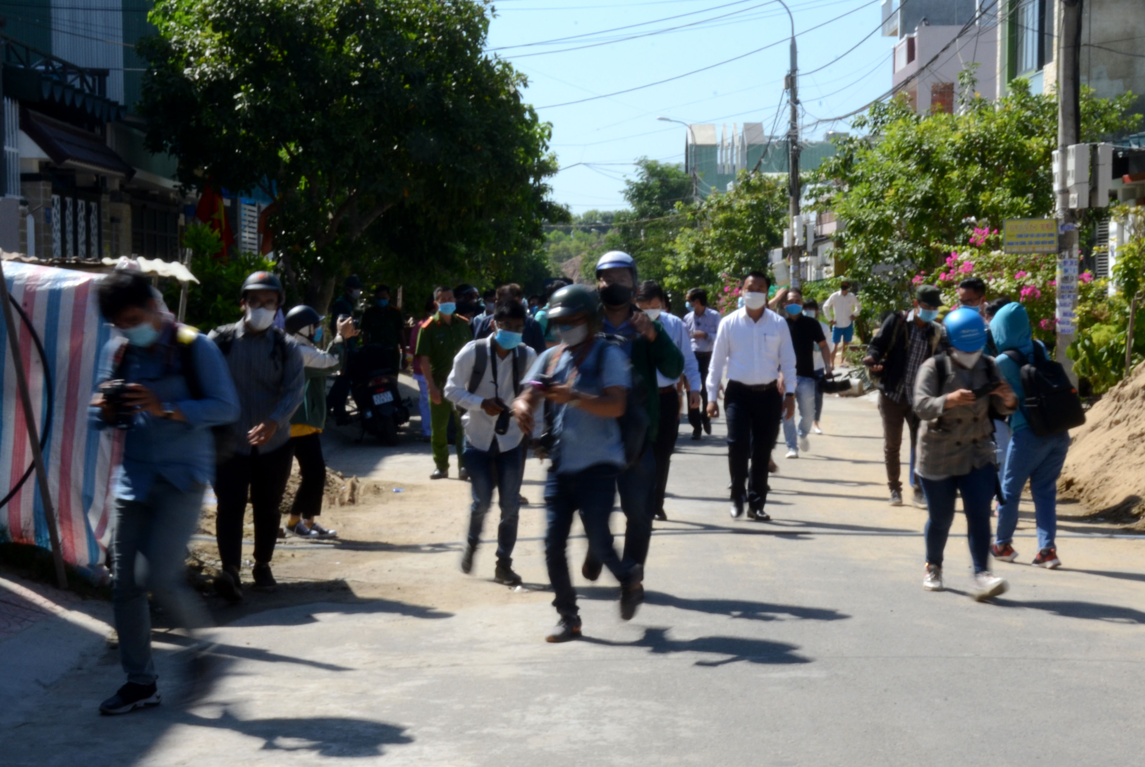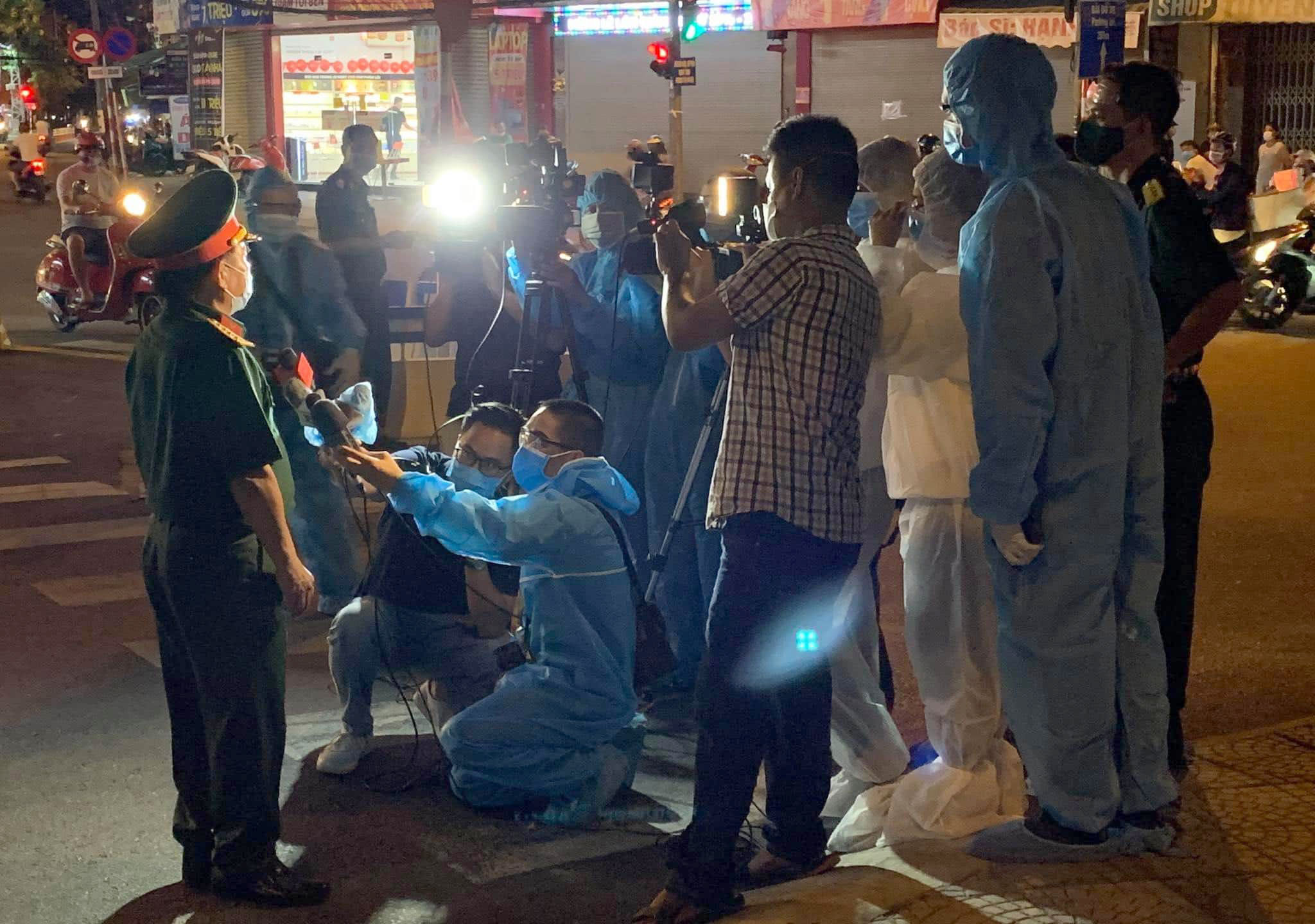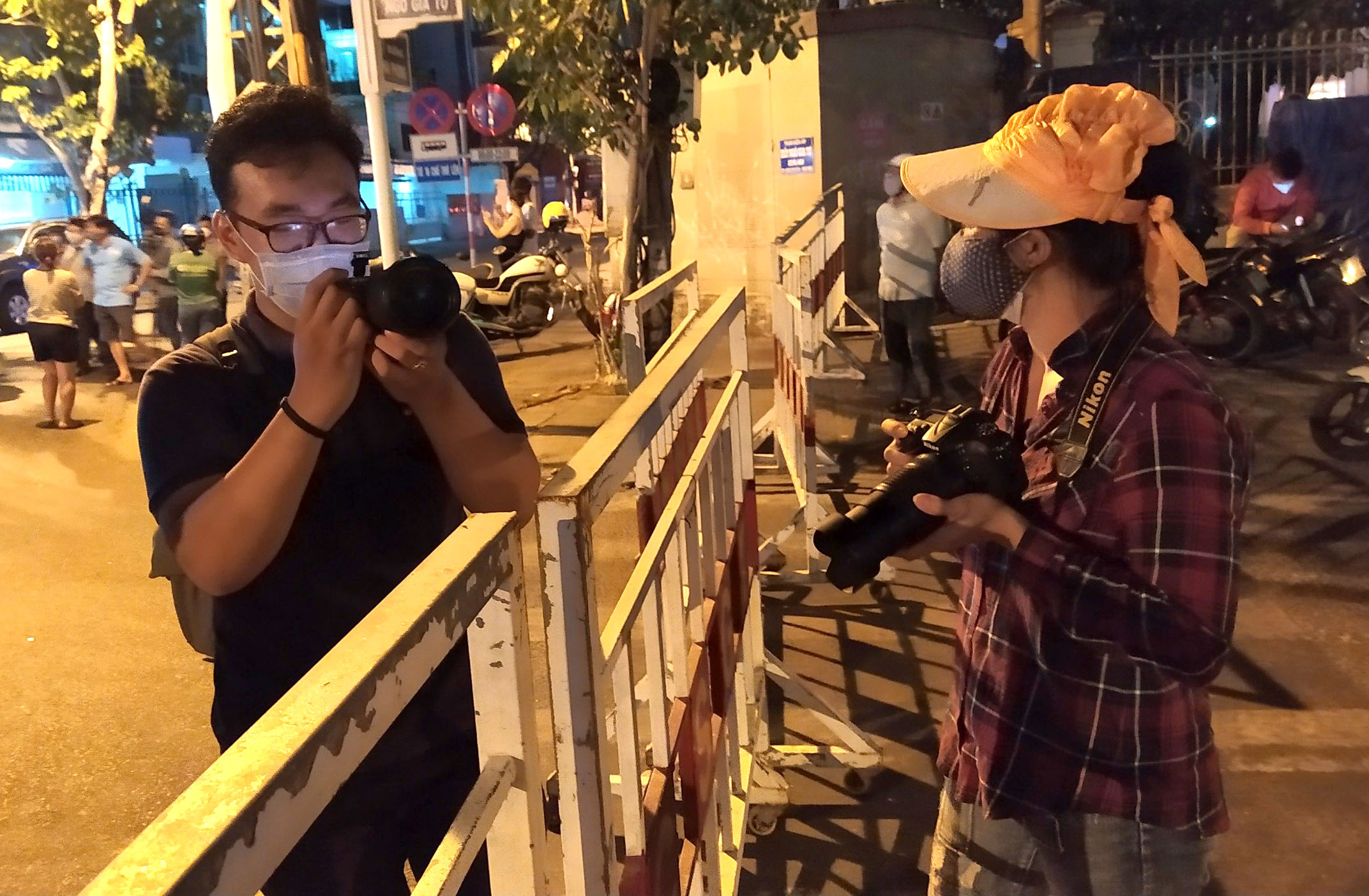 Các phóng viên chờ hiệu lệnh chính thức phong tỏa khu vực quanh bênh viện Đà Nẵng, vào lúc 0 giờ ngày 28/7. Ảnh: Quốc Dũng - TTXVN