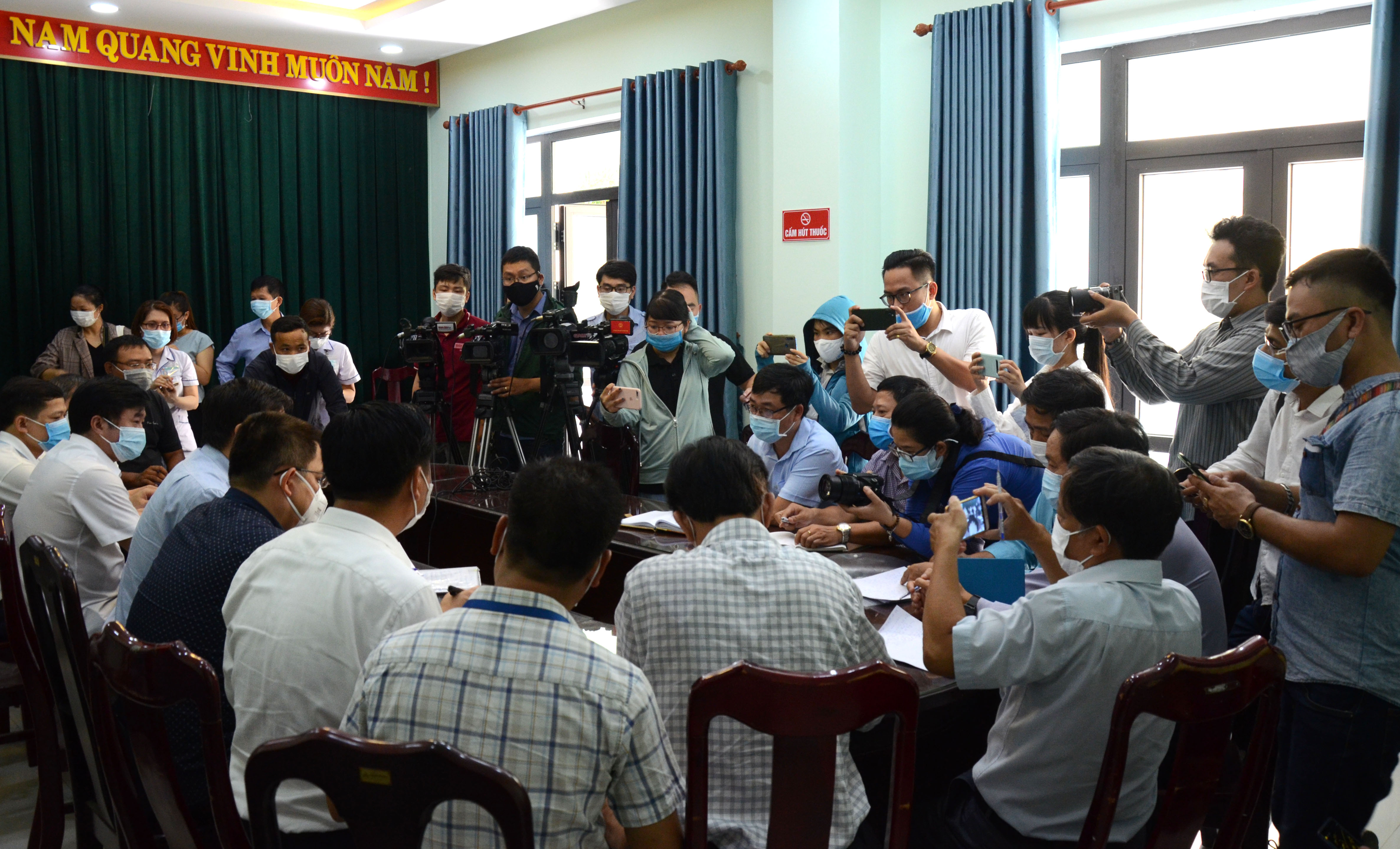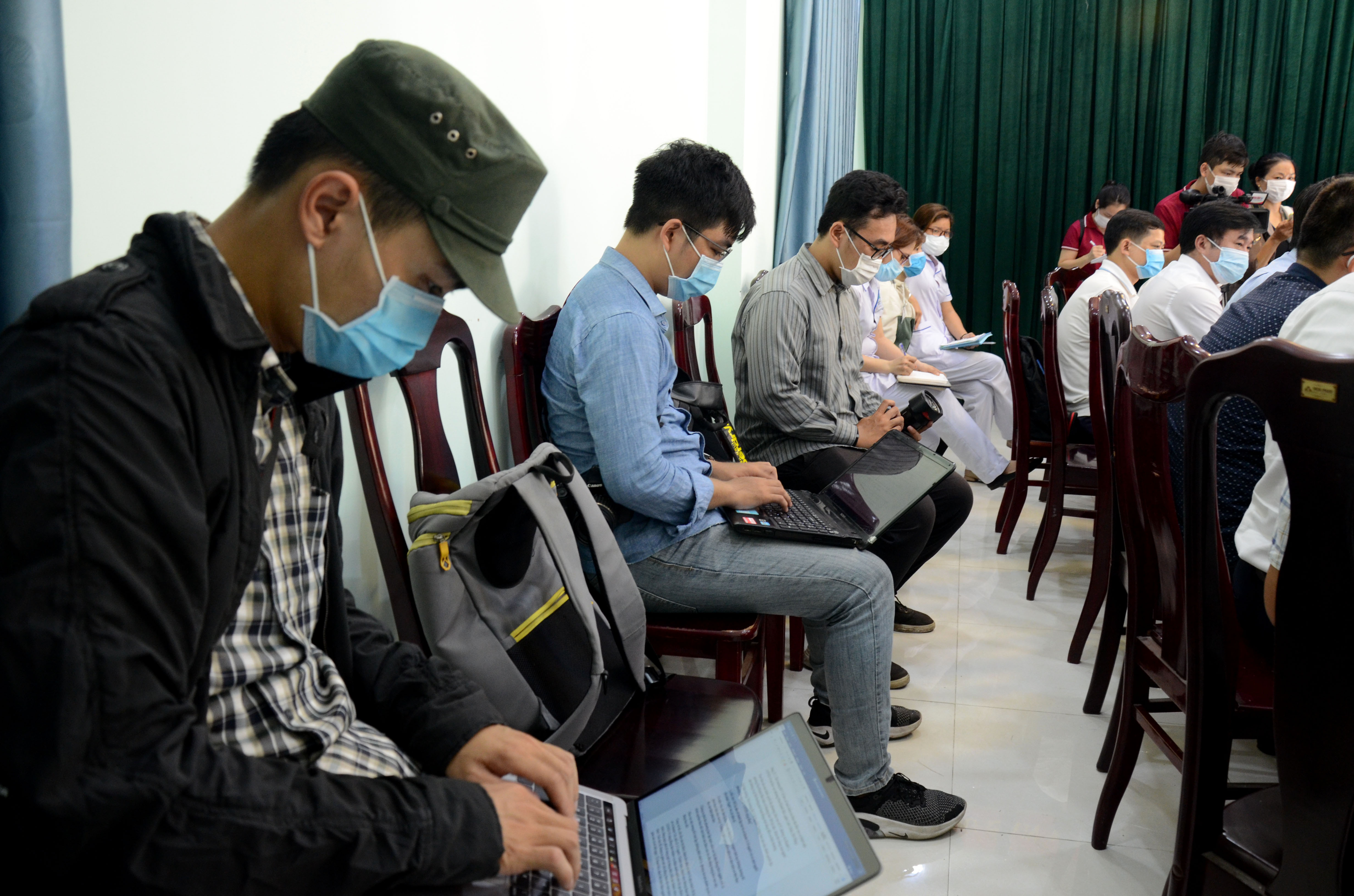 Các phóng viên tác nghiệp trong cuộc họp của đoàn kiểm tra Viện vệ sinh dịch tễ Trung ương với lãnh đạo quận Liên Chiểu (thành phố Đà Nẵng). Ảnh: Quốc Dũng - TTXVN