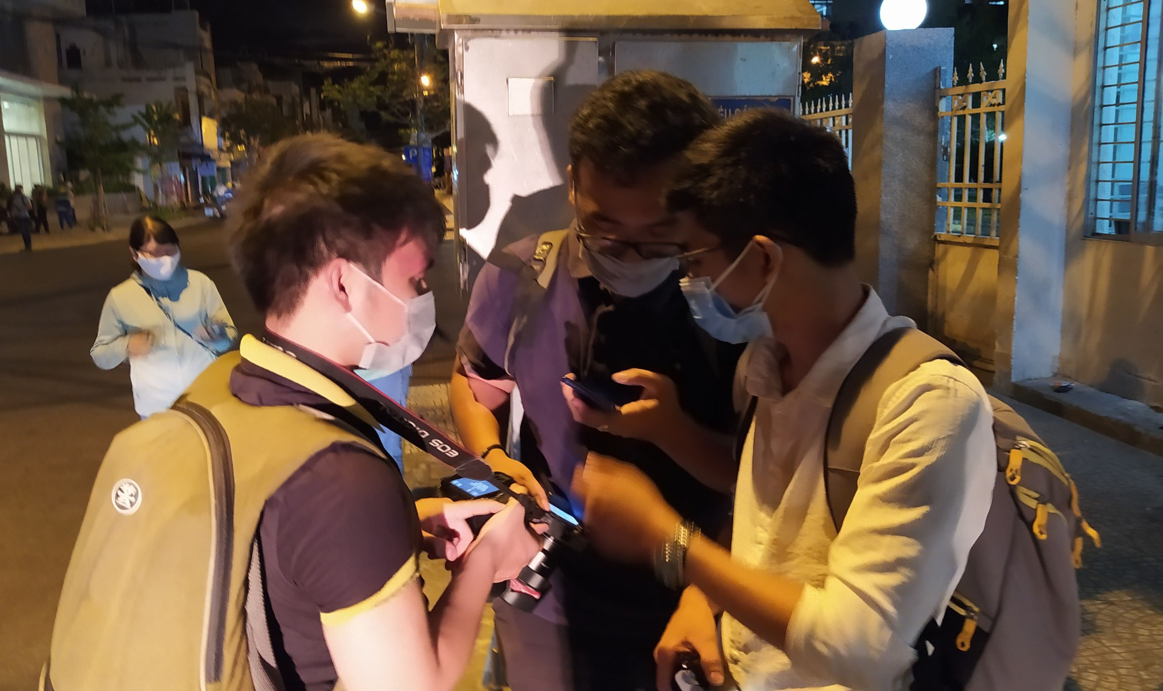 Các phóng viên thảo luận phương án tác nghiệp trong đêm chờ phong tỏa. Ảnh: Quốc Dũng - TTXVN