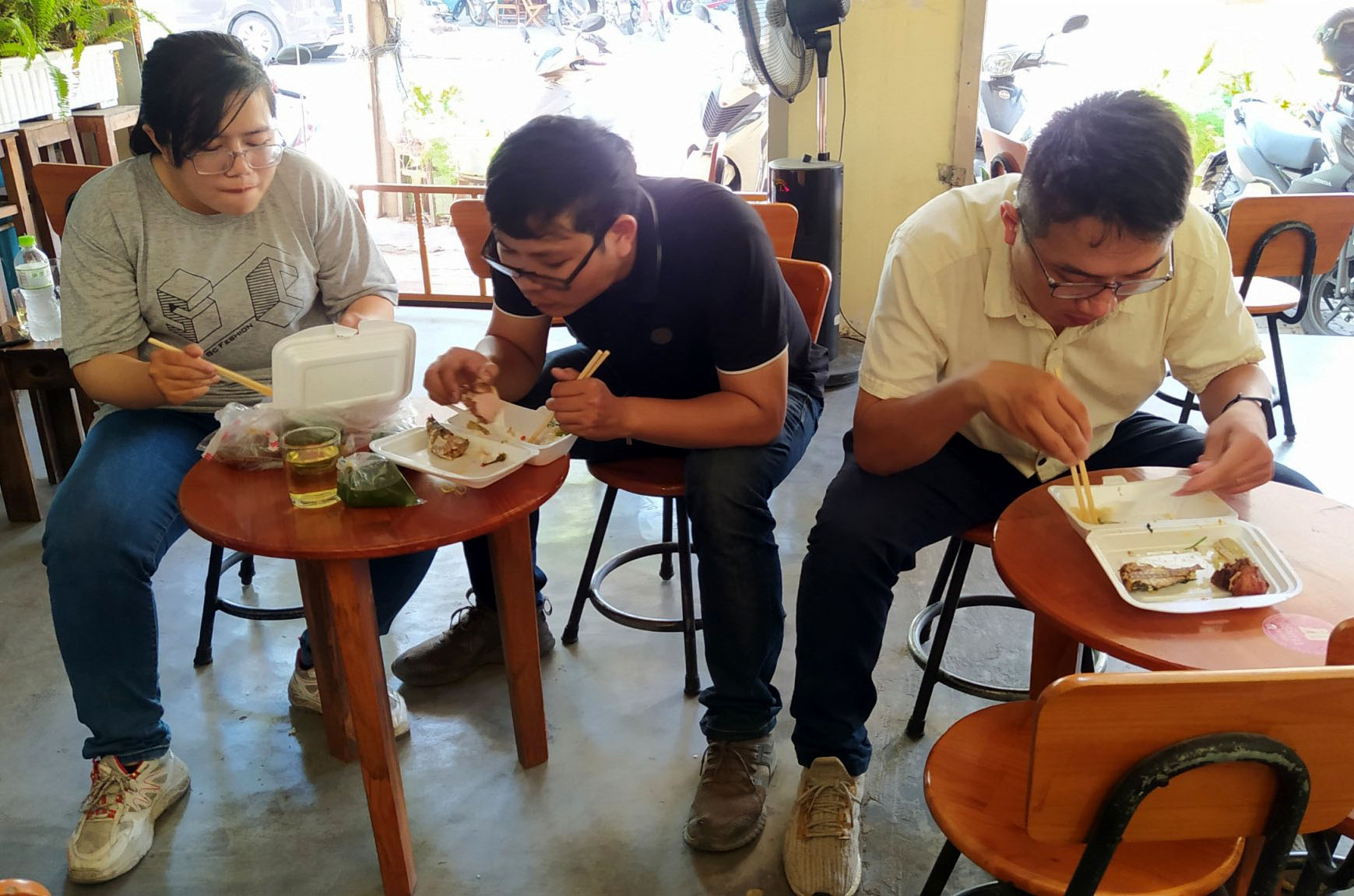 Bữa cơm vội của các phóng viên trên đường đi tác nghiệp. Ảnh: Quốc Dũng - TTXVN