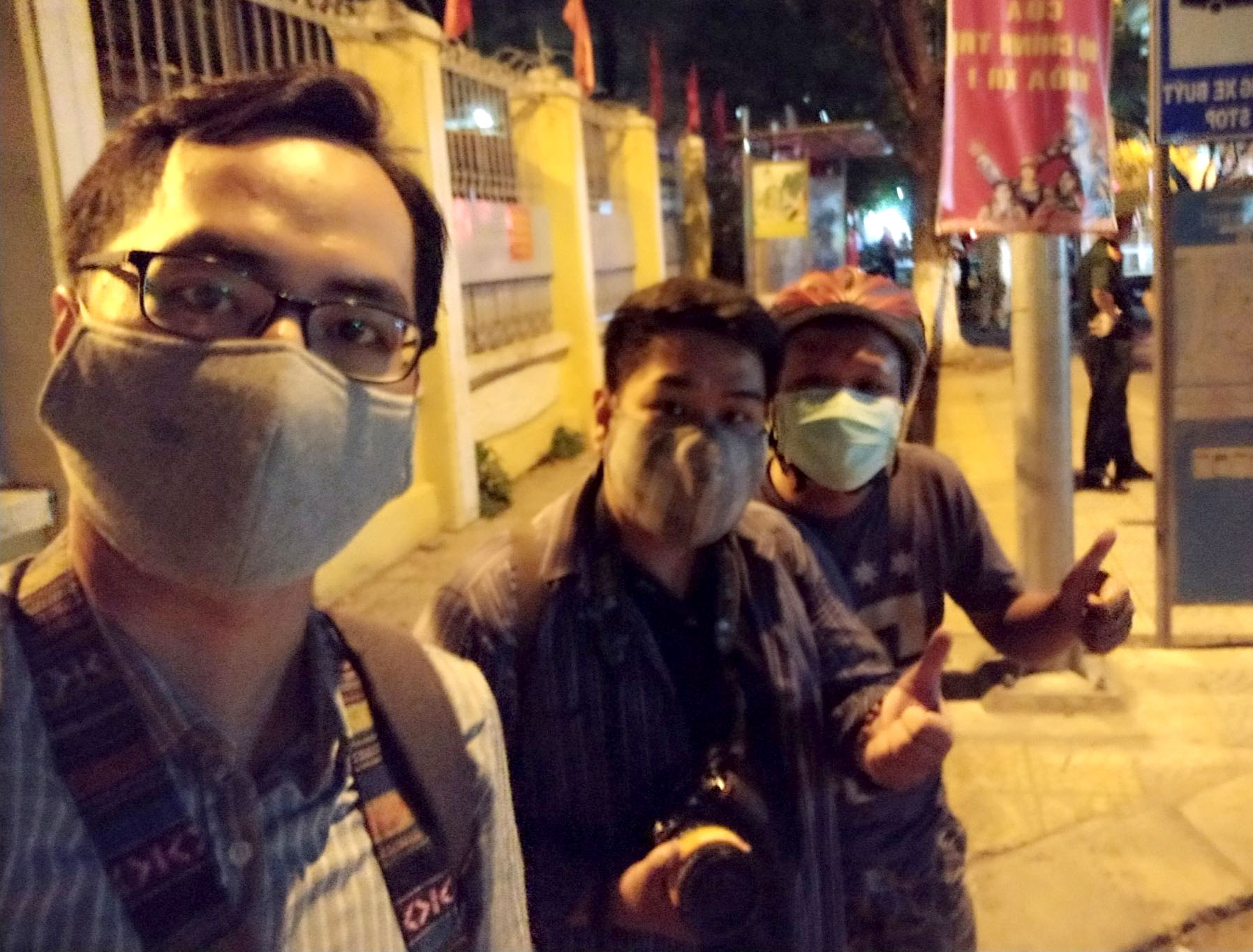 Tác giả (ngoài cùng bên trái) cùng các đồng nghiệp trong đêm chờ lực lượng quân đội phun xịt khử trùng bệnh viện Đà Nẵng. Ảnh: Quốc Dũng - TTXVN