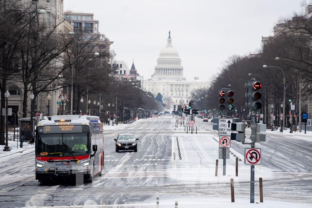 Đợt bão mùa Đông lịch sử, kéo theo nhiều cơn lốc có sức phá hủy khủng khiếp, tràn vào vùng Đông Nam nước Mỹ ngày 16/2/2021 đã khiến ít nhất 21 người thiệt mạng và hàng triệu người rơi vào cảnh mất điện. Trong ảnh: Tuyết phủ trắng xóa đường phố tại Washington D.C., Mỹ, ngày 18/2/2021. Ảnh: THX/TTXVN