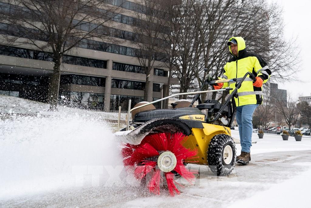 Công nhân dọn tuyết trên đường phố tại Arlington, Virginia, Mỹ, ngày 18/2/2021. Ảnh: THX/TTXVN