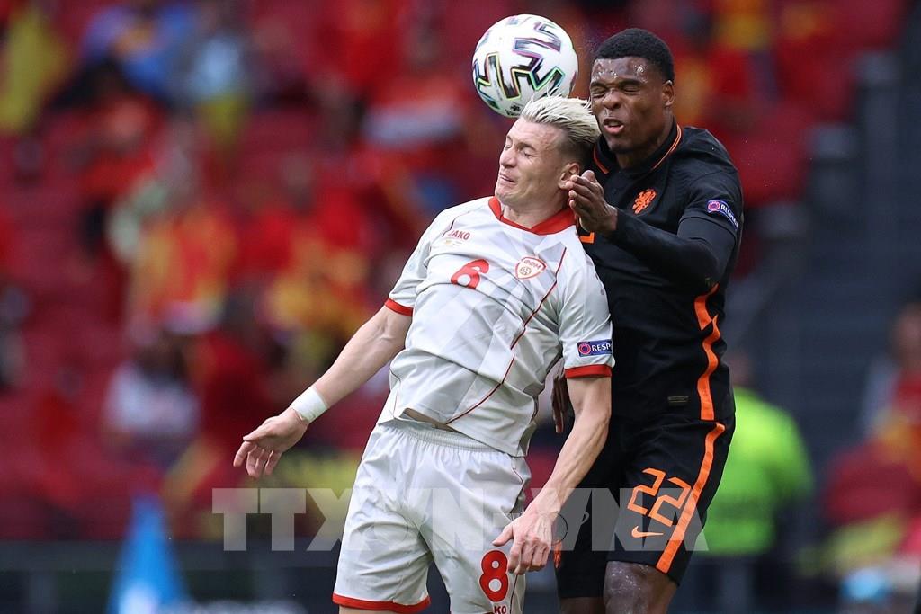 Sau hơn 10 ngày diễn ra, vòng bảng EURO 2020 đã khép lại với nhiều cảm xúc khó quên và sự tỏa sáng của không ít cầu thủ. Trong số đó, không chỉ có những ngôi sao lớn mà còn có cả những gương mặt ít tên tuổi đang thể hiện ấn tượng trên sân khấu lớn nhất của bóng đá châu Âu. Trong ảnh: Pha tranh bóng bổng giữa hậu vệ Bắc Macedonia Ezgjan Alioski (trái) và hậu vệ Hà Lan Denzel Dumfries trong trận đấu bảng C. Ảnh: AFP/TTXVN