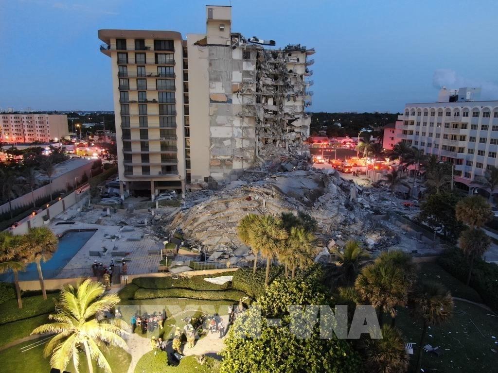Ít nhất 3 người thiệt mạng, 10 người bị thương và 99 người mất tích sau khi tòa nhà 12 tầng gồm 136 căn hộ ở thị trấn Surfside thuộc thành phố Miami, bang Florida, miền Nam nước Mỹ, bị sập vào lúc 1h sáng (giờ địa phương) ngày 24/6/2021 trong lúc nhiều người đang ngủ. Đến nay, 35 người mắc kẹt đã được giải cứu. Ảnh: THX/ TTXVN