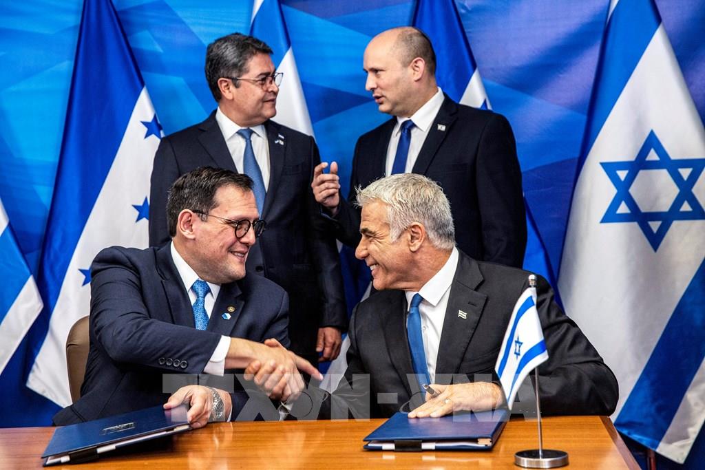 Honduras ngày 24/6/2021 đã chuyển Đại sứ quán tại Israel từ Tel Aviv đến Jerusalem, trở thành quốc gia và vùng lãnh thổ thứ 4 thực hiện hành động như vậy sau Mỹ, Kosovo và Guatemala. Trong ảnh: Tổng thống Honduras Juan Orlando Hernandez (trái, phía sau) và Thủ tướng Israel Naftali Bennett (phải, phía sau) cùng Ngoại trưởng Honduras Lisandro Rosales (trái, phía trước) và Ngoại trưởng Israel Yair Lapid tại lễ ký thỏa thuận song phương ở Jerusalem ngày 24/6/2021. Ảnh: AFP/ TTXVN