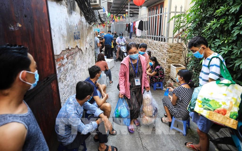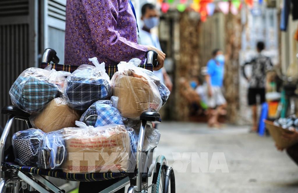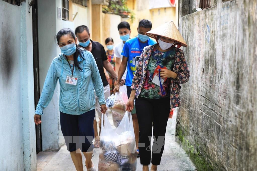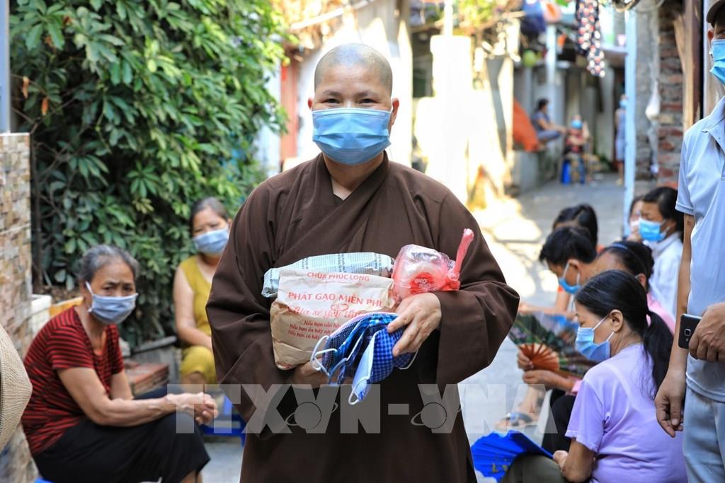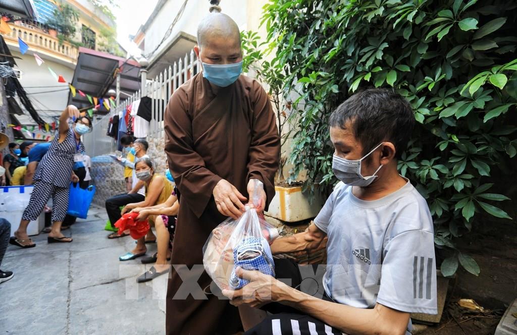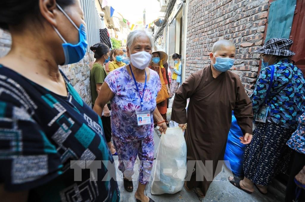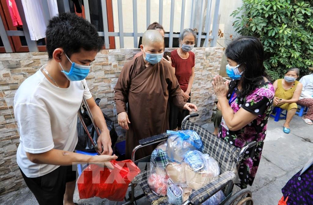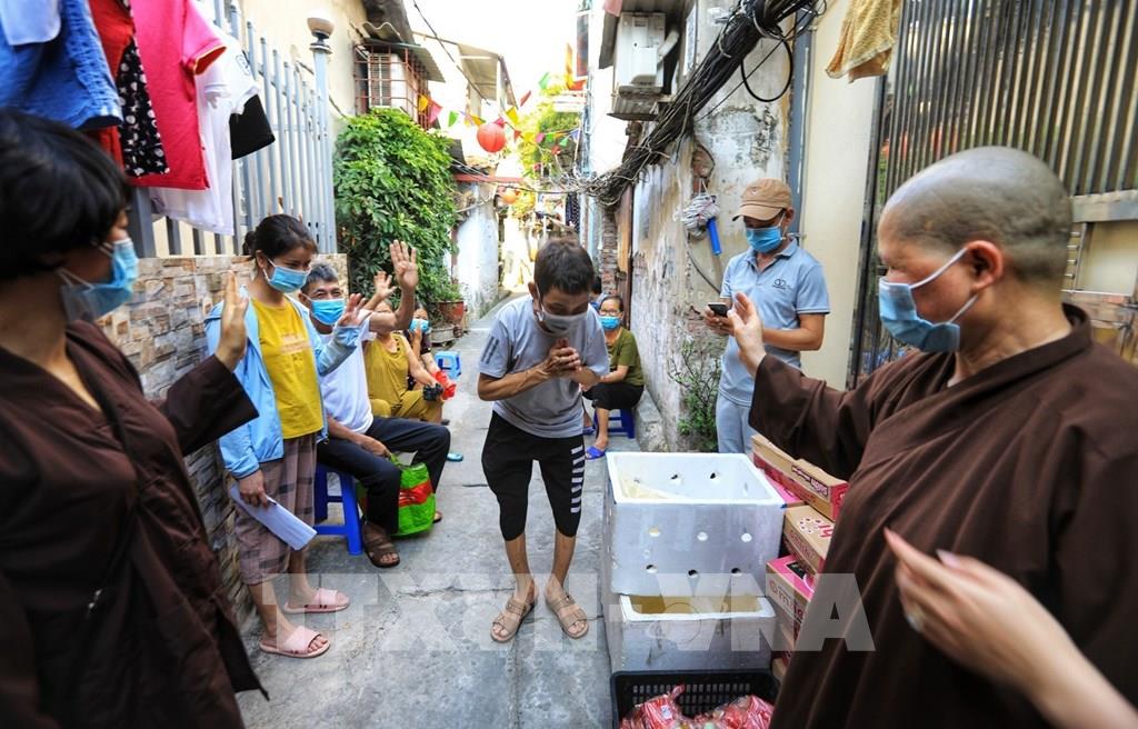 Chiều 14/5/2021, Chùa Phúc Long (Thanh Trì, Hà Nội) cùng các phật tử và nhà hảo tâm trao tặng 135 suất quà tới các hộ dân "xóm chạy thận" ở 121 Lê Thanh Nghị (phường Đồng Tâm, quận Hai Bà Trưng). Ảnh: Thành Đạt - TTXVN