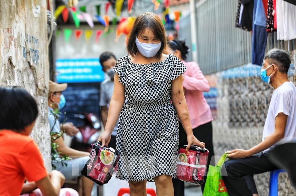Cư dân "xóm chạy thận" 121 Lê Thanh Nghị phấn khởi khi nhận những suất quà về chia cho người nhà. Ảnh: Thành Đạt - TTXVN