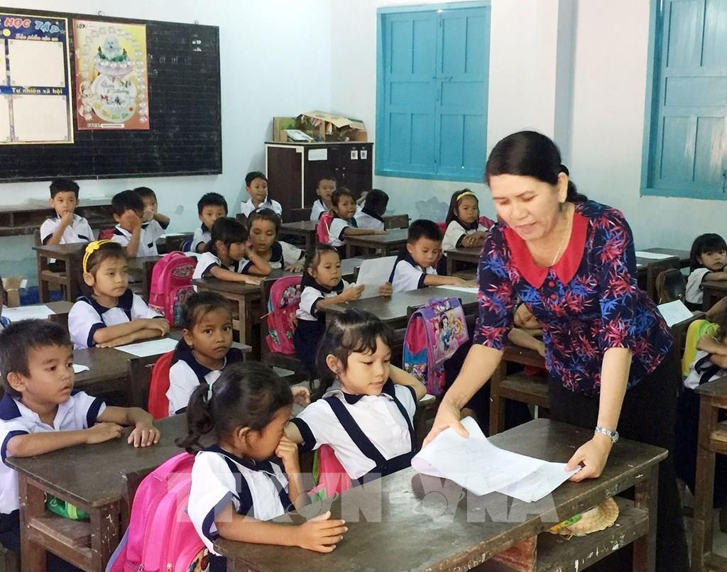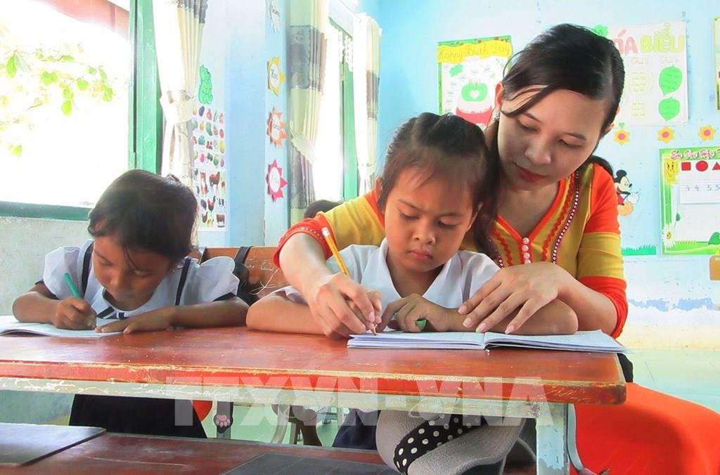 Chất lượng giáo dục vùng đồng bào dân tộc thiểu số, miền núi không ngừng được nâng lên. Đến nay, tất cả các xã miền núi đều có trường mầm non, tiểu học, THCS khang trang, cơ sở vật chất, trang thiết bị được đầu tư đáp ứng yêu cầu dạy và học. Trong ảnh: Cô giáo Chamaléa Thị Khuyên (dân tộc Raglai), trường Tiểu học Phước Thành A, xã Phước Thành, huyện Bác Ái, tỉnh Ninh Thuận luôn chăm lo giáo dục cho học sinh. Ảnh: Nguyễn Thành – TTXVN
