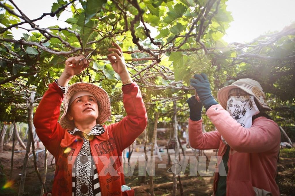 Nho là loại cây trồng đặc thù của Ninh Thuận, có hiệu quả kinh tế cao hơn so với các loại cây trồng khác trên cùng diện tích canh tác, hằng năm mang lại nguồn thu nhập đáng kể cho người sản xuất. Ảnh: Trọng Đạt – TTXVN