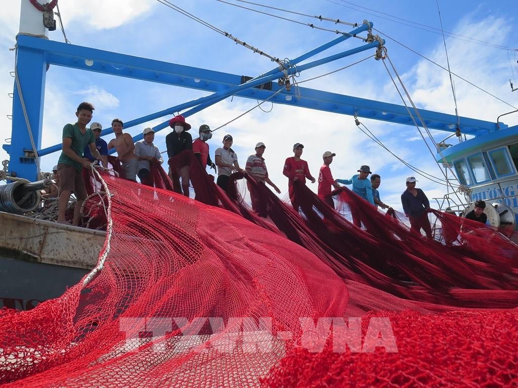 5 năm trở lại đây, Ninh Thuận đã có bước phát triển đột phá trong nhiều lĩnh vực. Tốc độ tăng GRDP bình quân đạt 10,2%/năm; GRDP bình quân đạt 60,1 triệu đồng/người, tăng 2,17 lần so với năm 2015. Trong ảnh: Ngư dân đưa lưới mới lên tàu cá tại cảng cá Mỹ Tân, xã Thanh Hải, huyện Ninh Hải, chuẩn bị cho chuyến ra khơi đánh bắt hải sản xa bờ. Ảnh: Minh Hưng-TTXVN