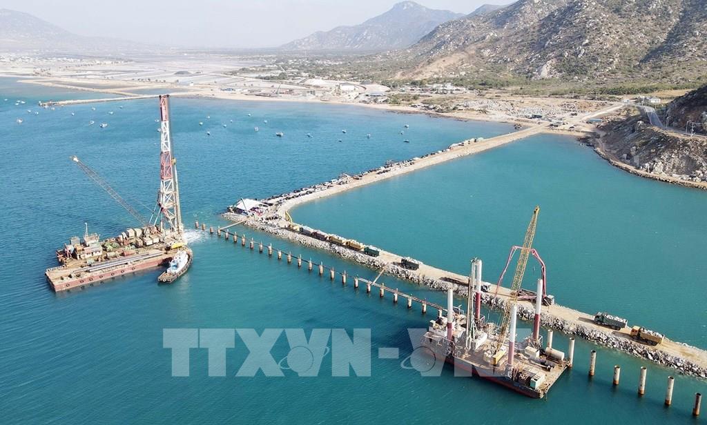 Sự đầu tư đúng hướng, khai thác hết lợi thế tiềm năng cùng sự hỗ trợ kịp thời của Chính phủ đã giúp kinh tế, xã hội của Ninh Thuận thực sự “cất cánh” trong những năm vừa qua. Trong ảnh: Dự án Cảng biển tổng hợp Cà Ná đang được thi công trên biển. Ảnh: Công Thử - TTXVN