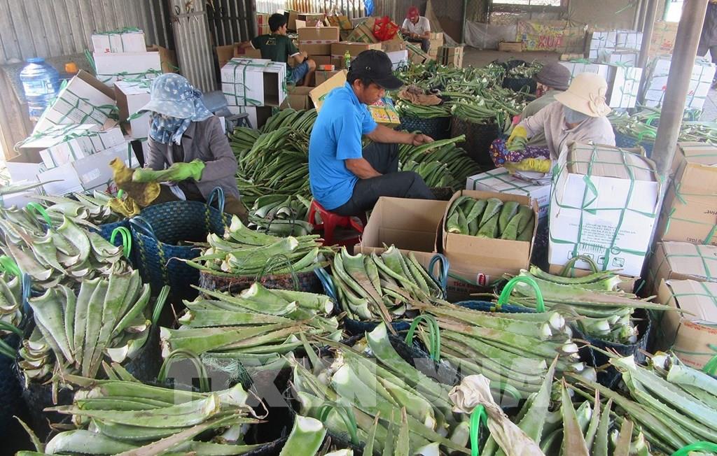 Tận dụng thời tiết nắng nhiều và đảm bảo nguồn nước tưới, nhiều hộ nông dân ở Ninh Thuận trồng nha đam, thu lãi hàng chục triệu đồng mỗi tháng. Ảnh: Nguyễn Thành - TTXVN