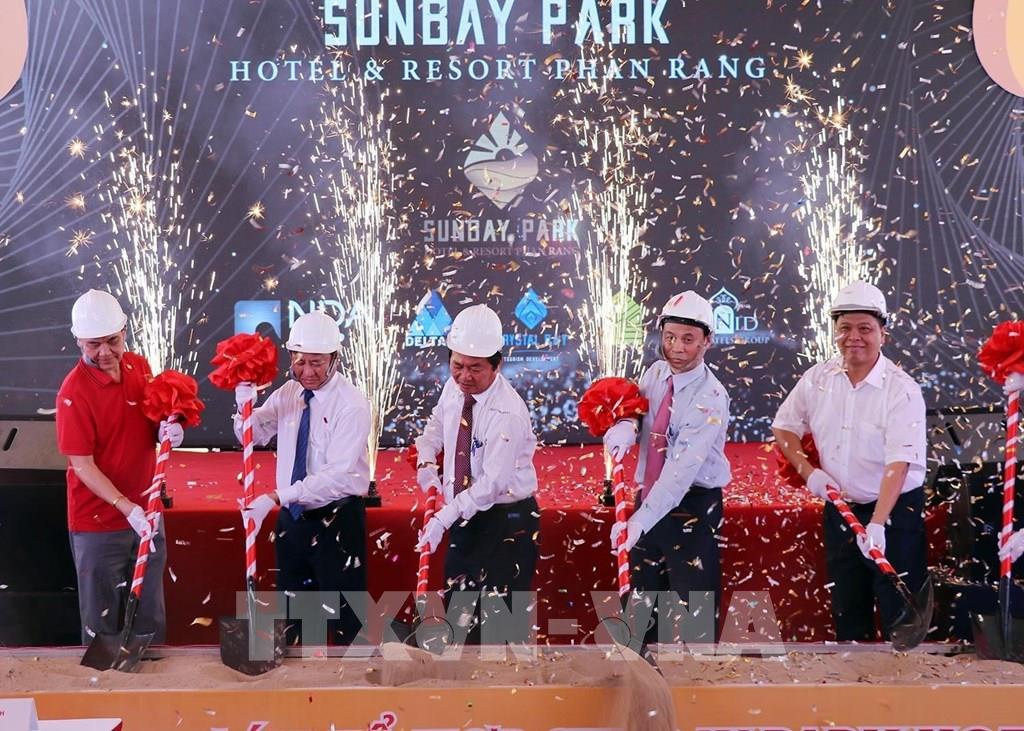 Theo định hướng chiến lược phát triển du lịch cao cấp, đưa Ninh Thuận trở thành trung tâm nghỉ dưỡng chất lượng cao với các trải nghiệm mới lạ, tập đoàn Crystal Bay và đối tác đã xây dựng tổ hợp giải trí nghỉ dưỡng biển SunBay Park Hotel & Resort Phan Rang mô hình ApartHotel chuẩn 5 sao quốc tế. Trong ảnh: Động thổ Dự án Tổ hợp nghỉ dưỡng SunBay Park Hotel & Resort Phan Rang tổng vốn đầu tư 4.500 tỷ đồng với khoảng 3.300 phòng khách sạn, dự kiến đưa vào khai thác trong tháng 6/2021. Ảnh: Công Thử - TTXVN