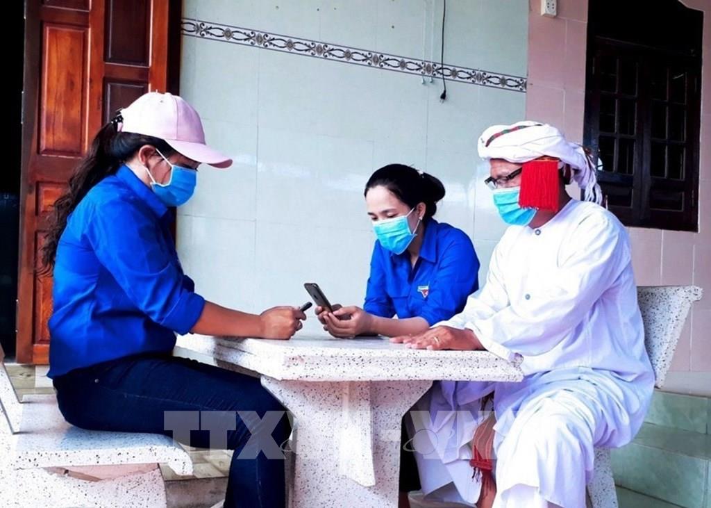 Phòng chống dịch COVID-19, lực lượng đoàn viên thanh niên Ninh Thuận có nhiều đóng góp tích cực trong việc tuyên truyền, hướng dẫn người dân tại địa phương thực hiện nghiêm việc khai báo y tế, hỗ trợ người dân cài đặt ứng dụng Bluezone trên điện thoại thông minh,... Ảnh: Công Thử - TTXVN