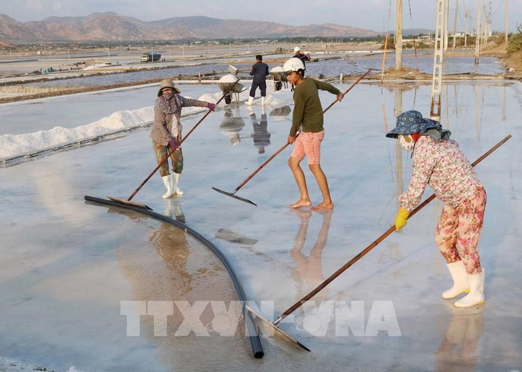 5 năm trở lại đây, Ninh Thuận đã có bước phát triển đột phá trong nhiều lĩnh vực. Tốc độ tăng GRDP bình quân đạt 10,2%/năm. Trong ảnh: Diêm dân huyện Ninh Hải thu hoạch muối. Ảnh: Nguyễn Thành – TTXVN