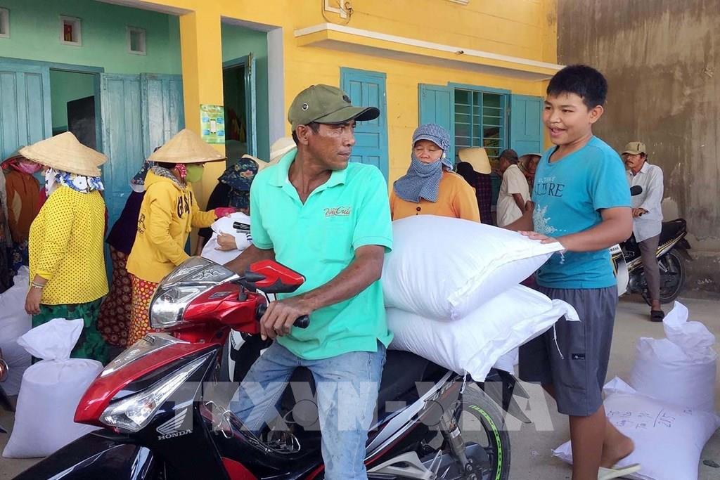 Cấp phát gạo cứu đói cho các hộ dân chịu tác động của hạn hán tại 5 huyện Ninh Sơn, Thuận Bắc, Thuận Nam, Bác Ái và Ninh Hải, năm 2018. Ảnh: Công Thử - TTXVN
