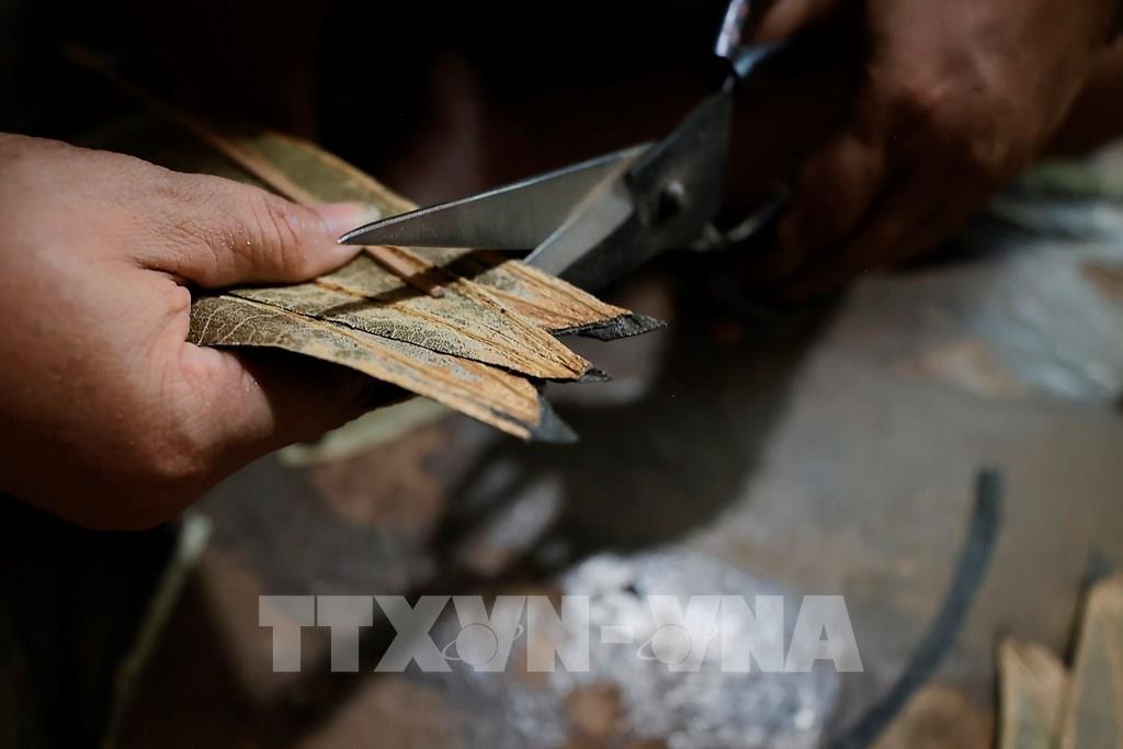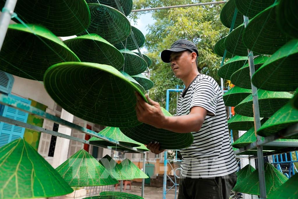 Nguyên liệu lá sen được xử lý qua các công đoạn, chuẩn bị cho người thợ khâu chằm nón. Ảnh: Minh Quyết - TTXVN