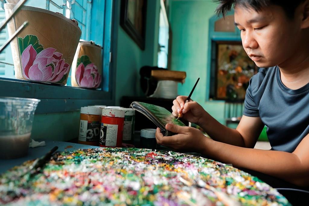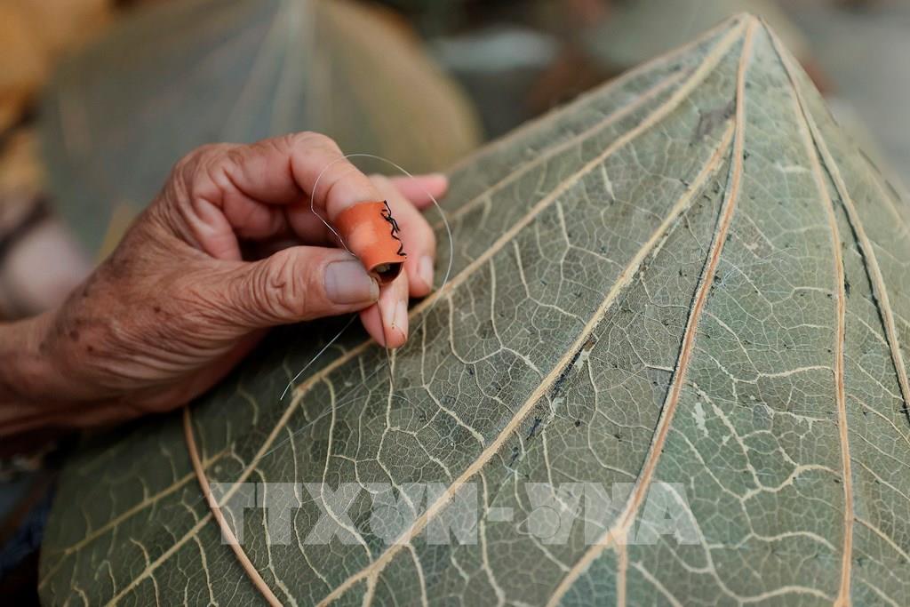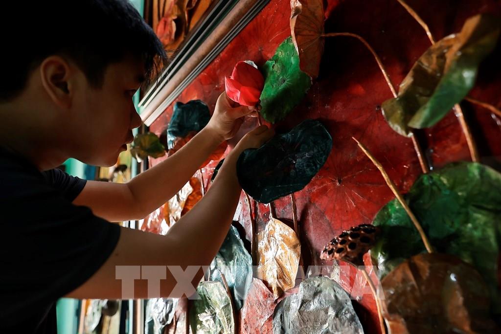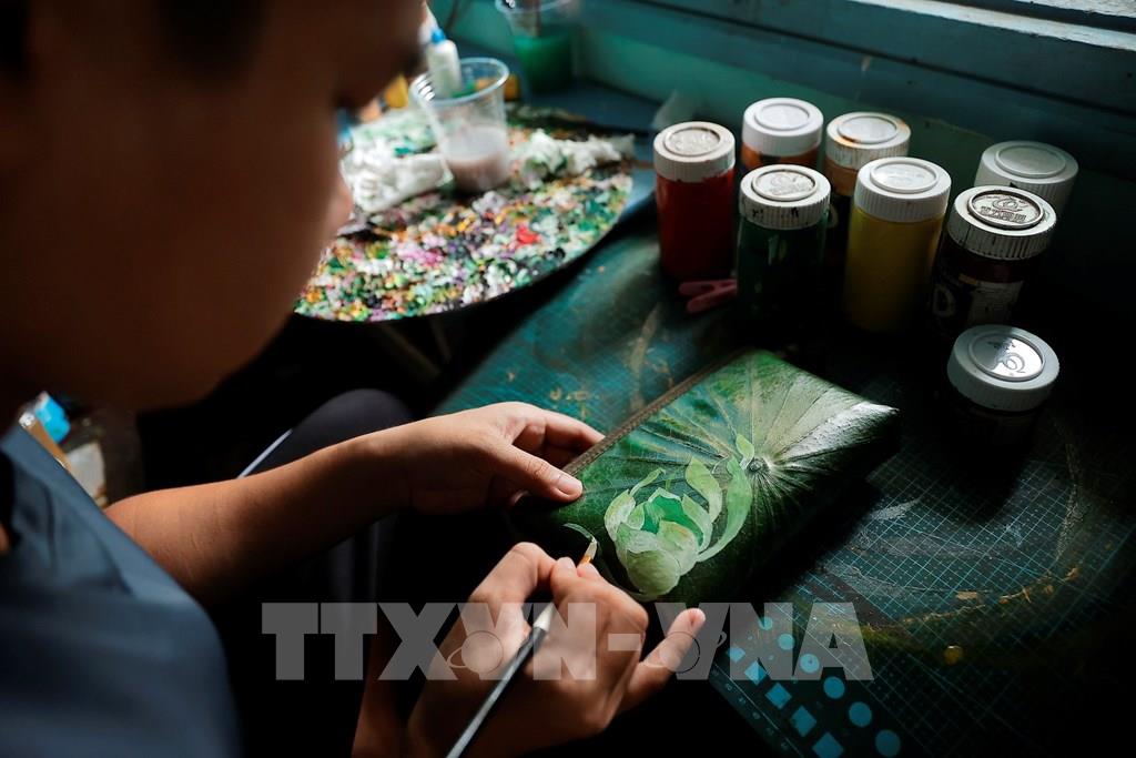 Sản phẩm được vẽ trang trí trên nền chất liệu là lá sen. Ảnh: Minh Quyết – TTXVN