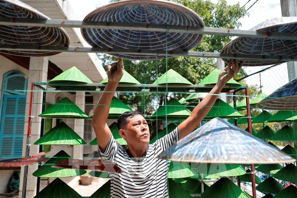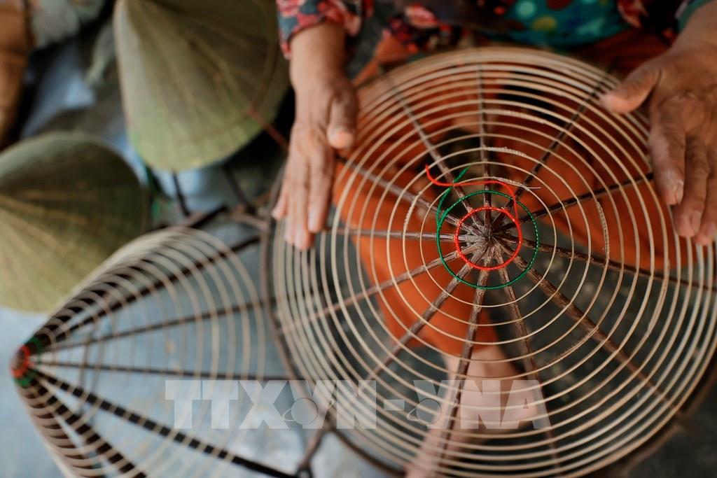 Theo chia sẻ từ những người thợ chằm nón Làng nón Đốc Sơ (P.Hương Sơ, TP Huế), so với nón truyền thống thì làm chiếc nón này đòi hỏi kỹ thuật cao hơn, khó hơn nên phải làm kỹ lưỡng và chậm hơn nón bình thường. Ảnh: Minh Quyết – TTXVN
