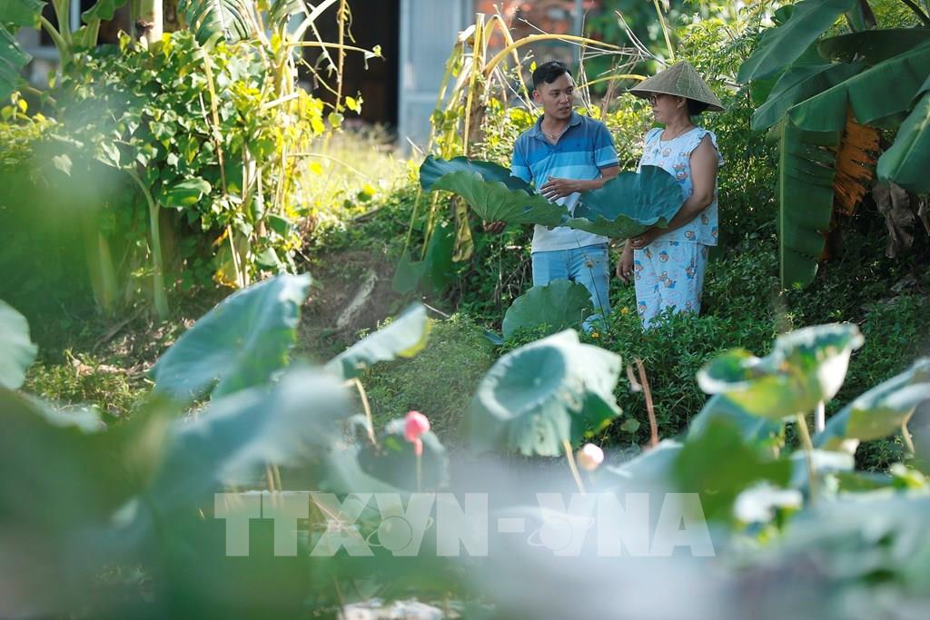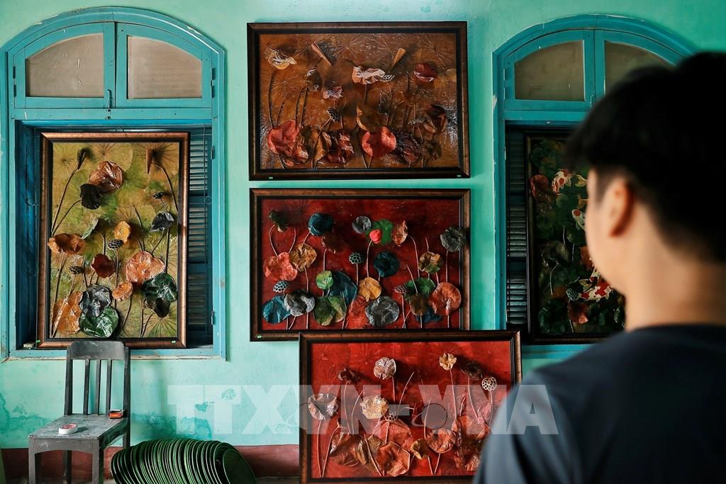 Bên cạnh sản phẩm nón sen độc đáo, cơ sở của Thảo còn làm những sản phẩm là tranh treo tường bằng chất liệu từ sen mang giá trị cao về thẩm mỹ và chất lượng. Ảnh: Minh Quyết – TTXVN