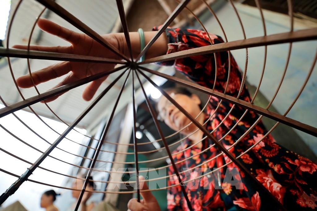 Người thợ chằm nón Làng nón Đốc Sơ (P.Hương Sơ, TP Huế) chuẩn bị nan tre được vót nhỏ uốn quanh khung hình chóp trước khi khâu chằm nón. Ảnh: Minh Quyết - TTXVN