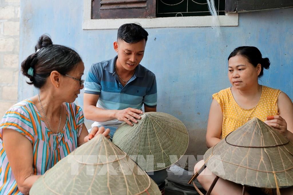 Anh Nguyễn Thanh Thảo trao đổi với những người thợ làng nón truyền thống Đốc Sơ (Huế) về sản phẩm nón sen. Ảnh: Minh Quyết - TTXVN