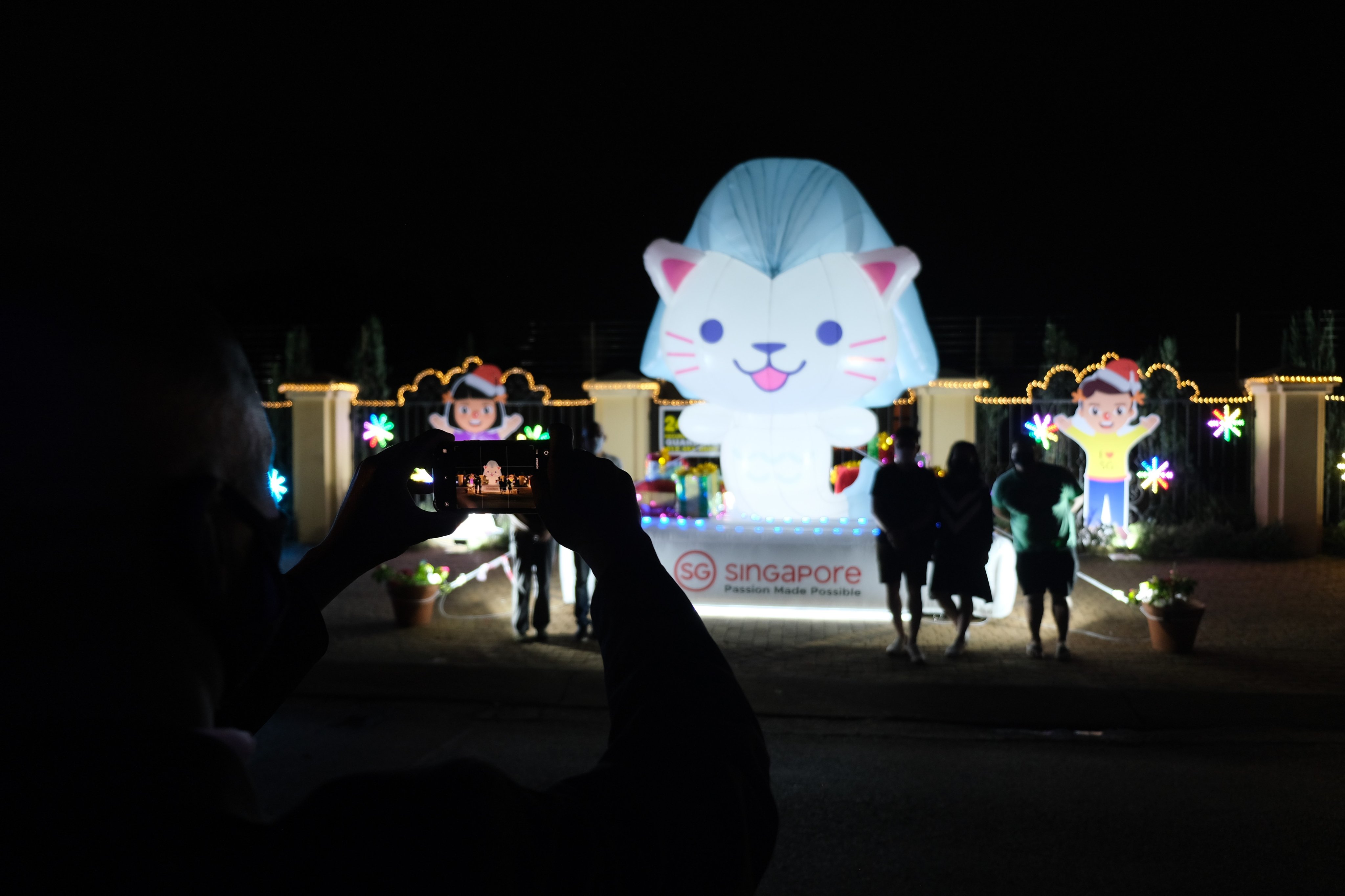 Bảo vệ khu nhà đại sứ Singapore tại Nam Phi giúp đỡ người dân chụp ảnh lưu niệm với mô hình biểu tượng của Singapore được thắp sáng trên phố Lawley. Ảnh: Hồng Minh/TTXVN