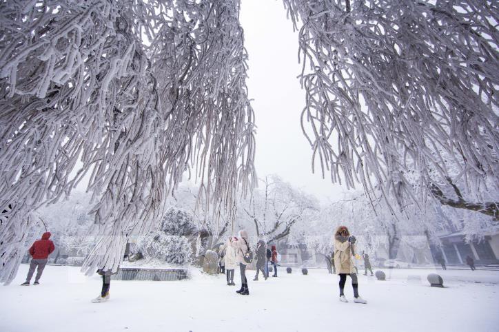 Khách du lịch ngắm tuyết rơi tại Núi Lư Sơn, tỉnh Giang Tây Trung Quốc ngày 8/12. Ảnh: THX/TTXVN
