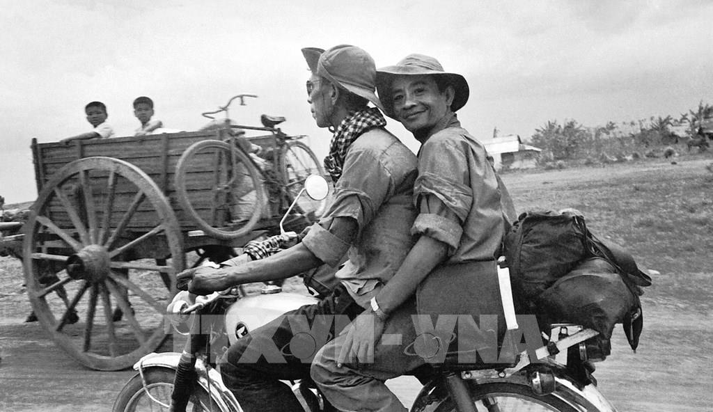 Phóng viên Thông tấn xã Giải phóng Nguyễn Đức Giáp (ngồi sau) cùng đồng nghiệp trên đường tiến về Sài Gòn trong chiến dịch Hồ Chí Minh, tháng 4/1975. Ảnh: TTXVN